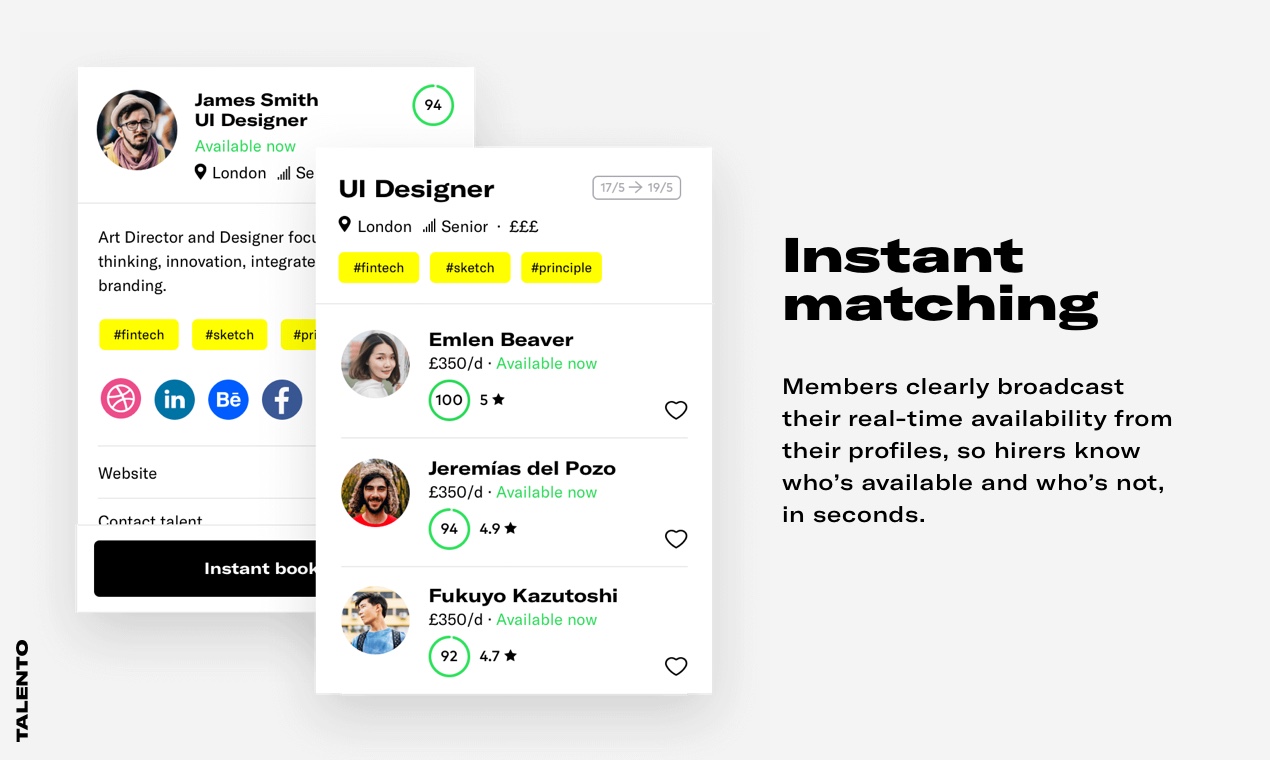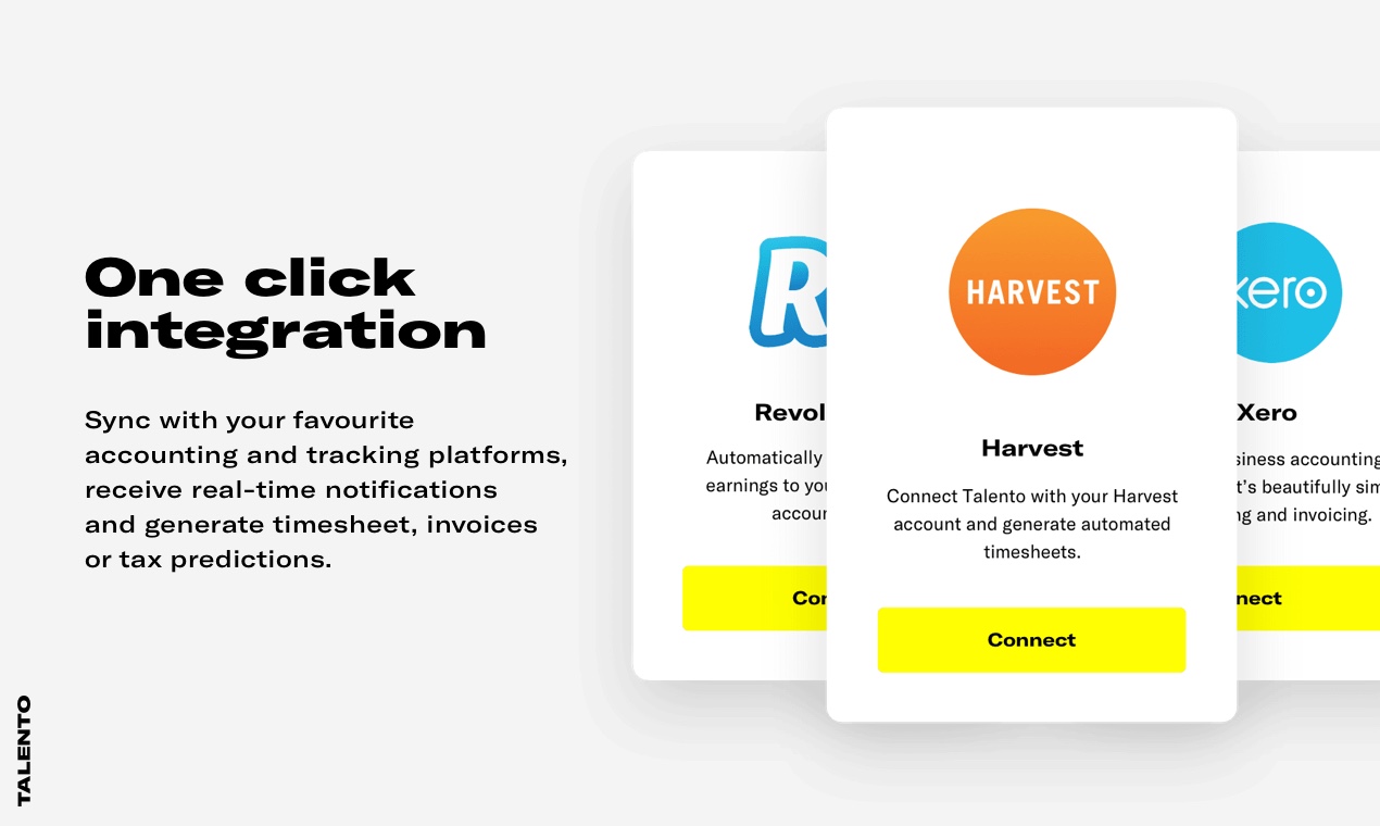 Talento is the app for creative, tech and digital marketing freelancers who work onsite or on-demand. Get instantly matched by companies, generate timesheet, invoices or tax predictions, enjoy the same benefits as a full-time job. #makefreelancework 1. Instant matching 2. One click integration 3. Hand-picked network of freelancers 4. Benefits and Perks