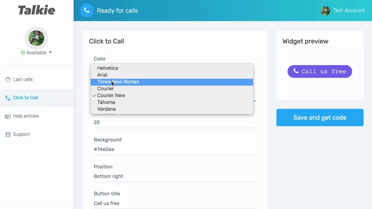 Free Click to Call Receive web calls from your site free. Talkie is a free service to communicate with your customers visiting your website. Always free. How Talkie works? Install our Click to Call widget on your website and your customers will be able to talk to you immediately for free just clicking on our customizable widget. Since it is a web call you can have information from your customer such as city, url from which you made the call, etc... We offer you a way to receive calls from your customers from anywhere in the world, free for both and without a limit of minutes.
