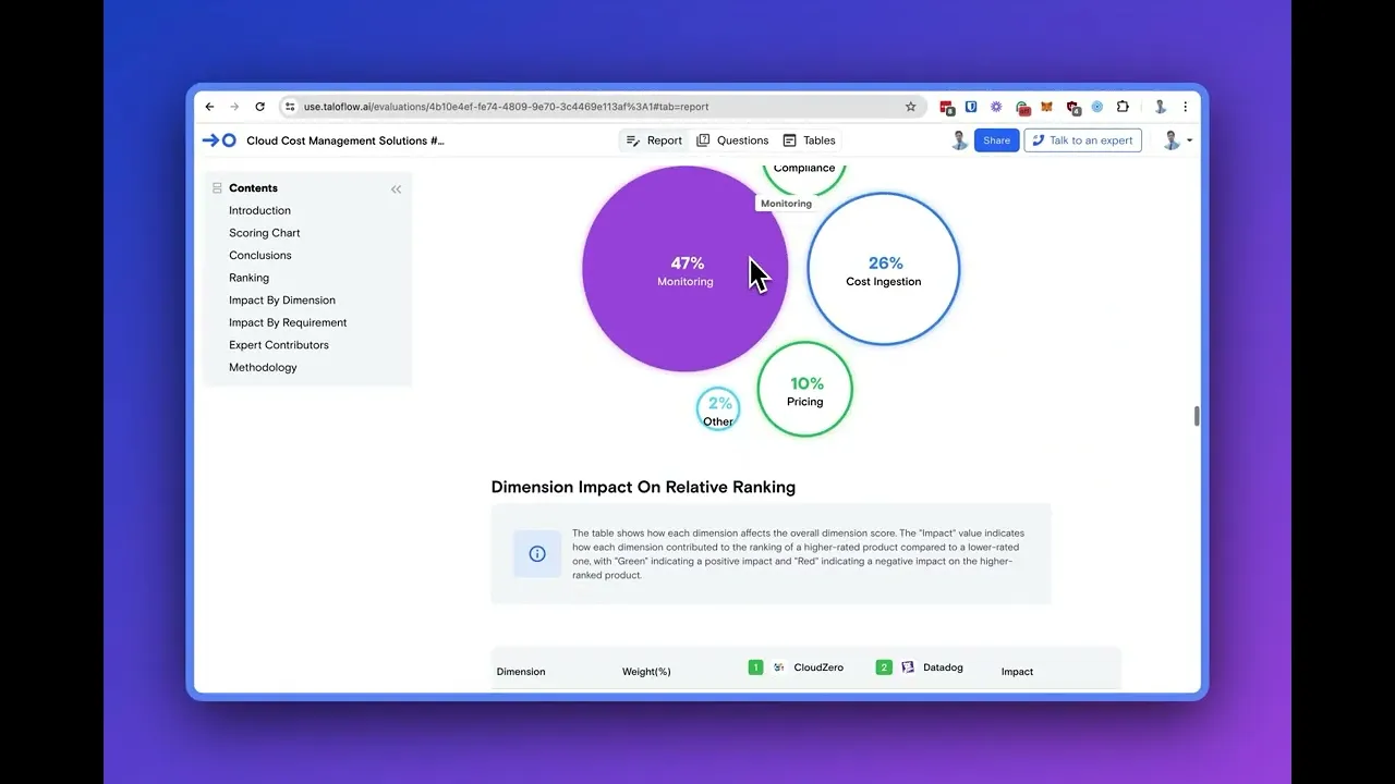 Taloflow replaces homegrown software/tech selection processes that last weeks or months with collaborative notebooks and AI to generate comprehensive rankings, "cover your assets" (CYA), and requirements tables. Unlike Gartner or G2, which offer mostly generic insights, our platform creates tailored reports for specific use cases. We’re used for hundreds of decisions – including by the Fortune 500 – in dozens of categories.