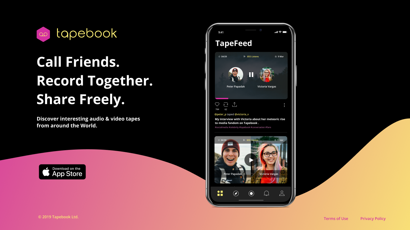 Tapebook is a new social network for audio and video conversations. Text and image based status updates are so 2005. The future status update will be real people, having real conversations, together or solo. The next wave of social will bring us back to our authentic roots. On Tapebook, anyone can call friends, record audio or video updates together, and share it on the TapeFeed for the community to like, repost, and share. We will be launching an app update soon with improvements and features like: comments, ability to make longer tapes, private tapes, and more! =) Download the app here: https://apps.apple.com/us/app/tapebook-social-networking/id1459260367 Visit our site: https://tapebook.app Or find us across all social channels: Twitter, Instagram, Facebook, LinkedIn, YouTube, Product Hunt.