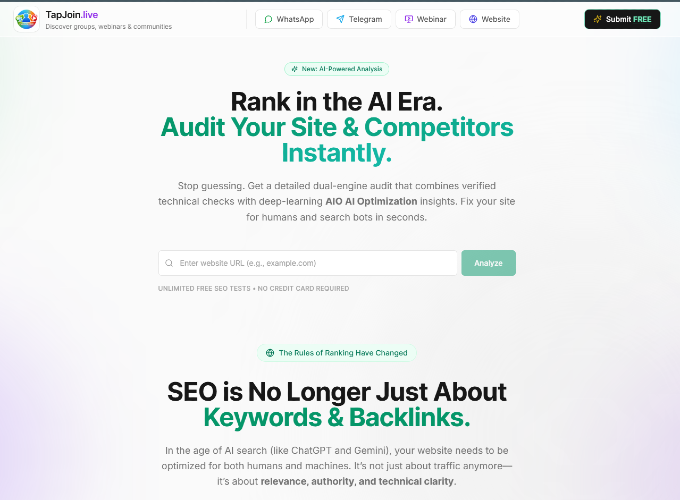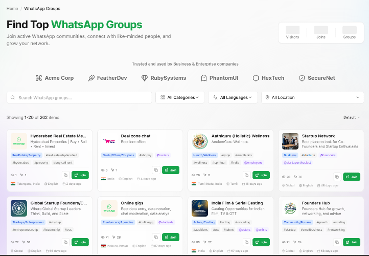 TapJoin.Live - Free listing for website, whatsapp, telegram - get free backlinks Discover Easily: Find active WhatsApp groups, Telegram channels, webinars, and websites sorted by category (jobs, real estate, learning, business, hobbies), country, and language—no dead links or wasted time. List for Free: Add your own group, channel, webinar, or website at no cost. It's a quick setup to gain visibility and attract new members or visitors. Boost Traffic & SEO: Get free backlinks to improve your search rankings and drive real traffic to your stuff. Grow Effortlessly: Perfect for startups, freelancers, and small businesses—I've seen it help expand networks without spending a penny. Check it out: https://tapjoin.live/ – just browse, list, and connect!