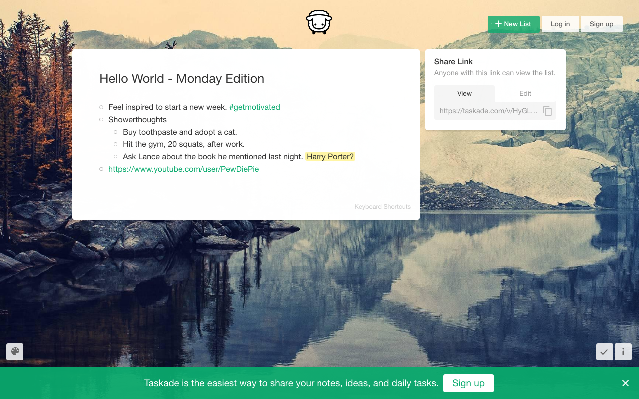 Taskade is a simple to-do list and task manager. You can instantly make a list and share it with your friends, family, and colleagues. Use Taskade to capture your ideas, goals, and daily tasks. Simple, clean, and beautifully designed with relaxing themes and backgrounds. Taskade declutters your thoughts so you can focus on your tasks, ideas and getting things done.