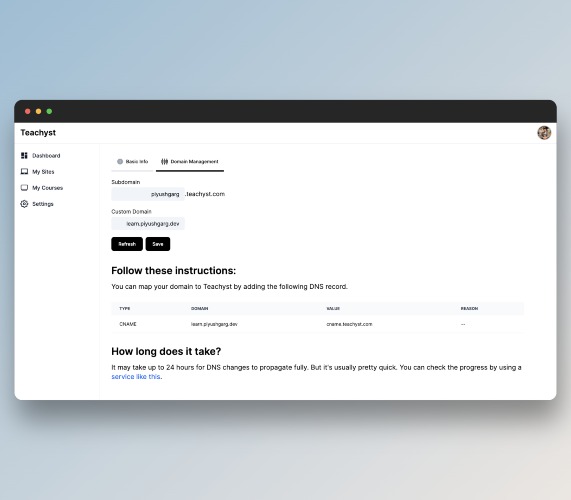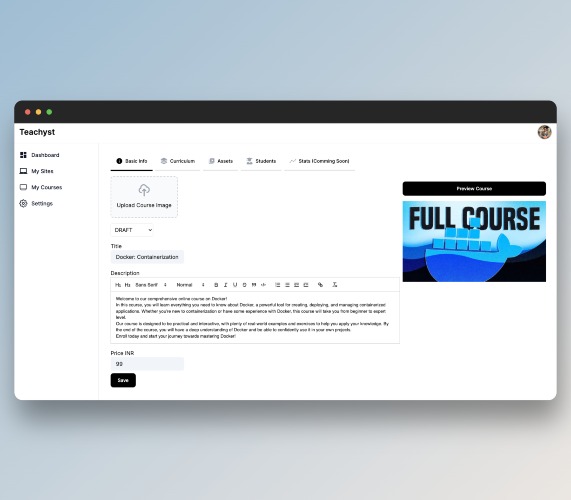 Teachyst is an online platform for educators where educators can create, manage and sell their courses online. We support custom domains and integrations so that educators can have a fully white-labeled platform to sell and market courses. Few features - Custom Stripe Integration - Multiple Website Support - Custom Script and Thrid party integrations - SEO Out of the box