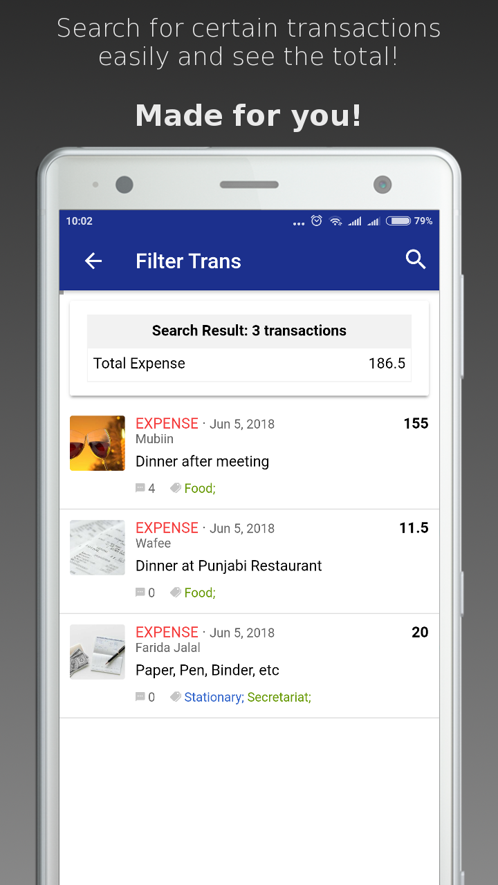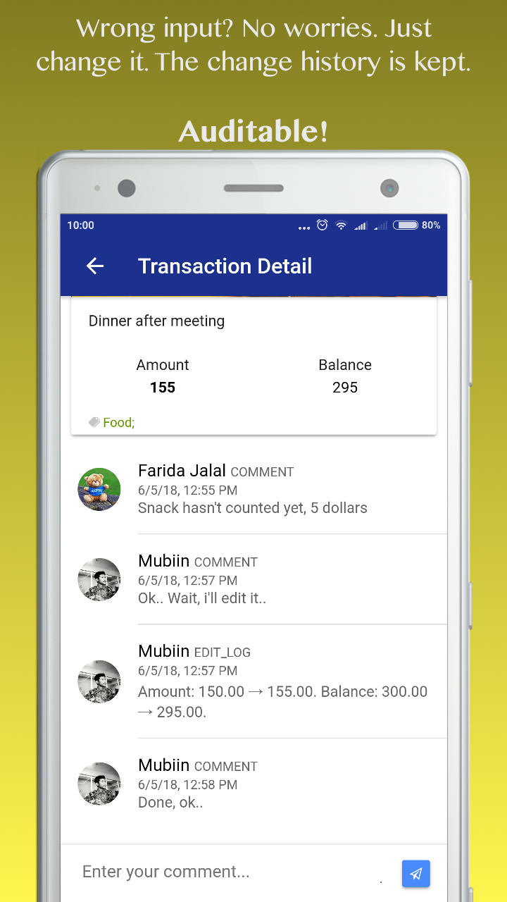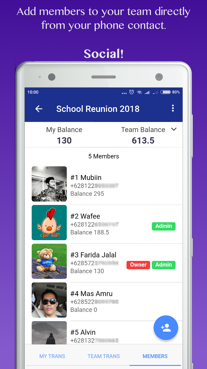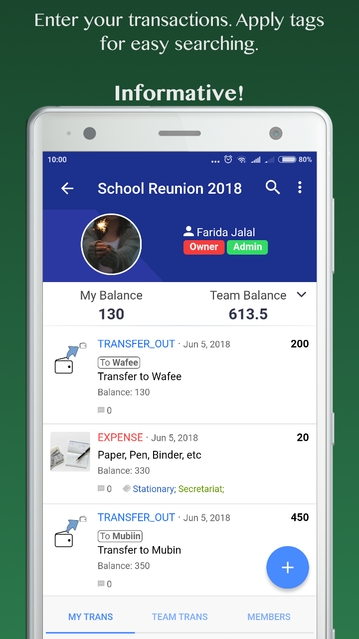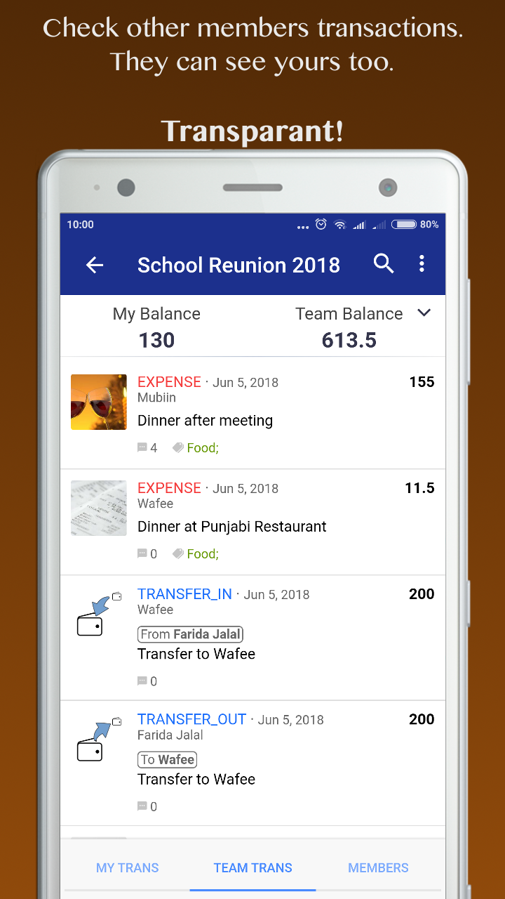 Team Money (Teamo) is a Collaborative Budget Management app. It administrates money belongs to a team. All team members can see who bring the money and how much, what the money is used for, and transfer the money among them. Members can also search for transactions by date, description, tags and other attributes. There are 3 types of transactions: CAPITAL, TRANSFER and EXPENSE. Capital is the sum of money the team have. It is the first transaction that need to be registered for other transactions to occur. The amount of the capital is registered to the balance of the user who done it. Afterwards the user can transfer the money to other users or spend it (expense). User that receives the transfer can spend it or transfer to other users. At the end, user can see the reports of the transactions. In a glance, user can see how much money left, all expense transactions, who hold the money, categorize expense by tags etc.