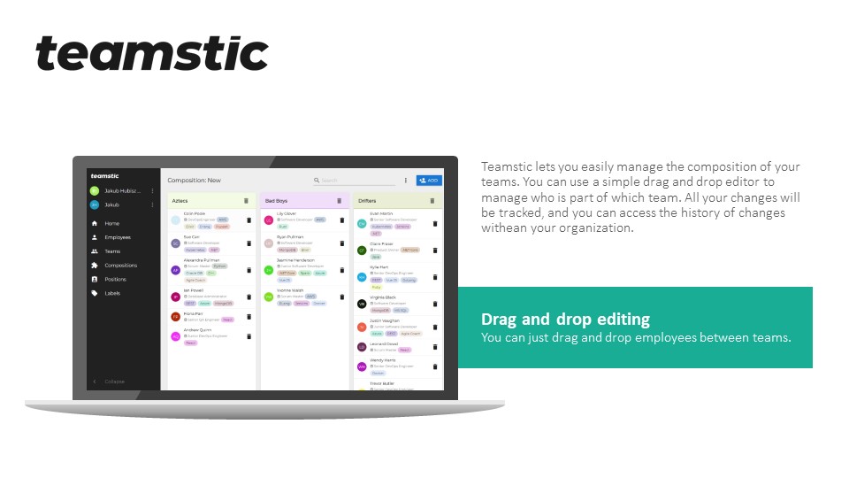Simple tool for managing and tracking history of changes in your teams. Lets you put in information about employees, organize them into teams, and drag and drop them between teams. Functionality we've got today is: - Ability to create multiple organizations - Ability to create teams and employees within the app - Ability to add employees positions - Ability to add labels to the employees - Ability to manage compositions (compositions in the app are versions of the org, you might compare it to branches, where the current active composition is the master) - Visual editor with drag and drop for managing the teams The functionality currently is limited, as we want to first prove if this would be useful for people managing teams, but some things that we would like to add to the app are: -Employee profiles with photos, dynamic fields, etc. for storing employee information. -Employee calendars (with working hours, leave, and workplace) with ability to overlay for a whole team -Employee skills and competencies with ability to filter employees by those. -Employee hierarchy for modeling manager - direct relation (currently we only have teams). -Employee DISC profile with ability to show DISC distribution in the team.