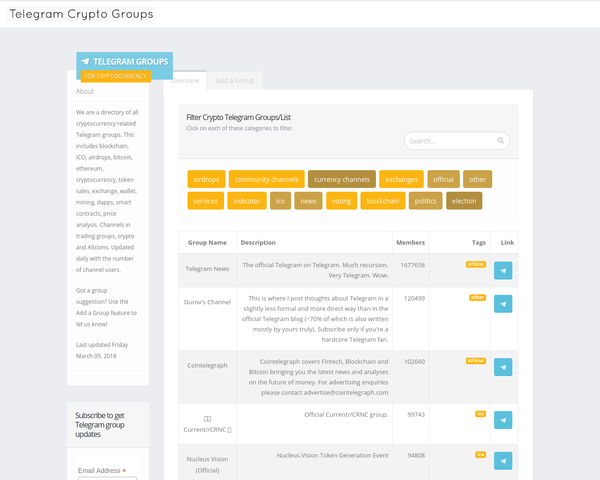 We are a directory of all cryptocurrency related Telegram groups. This includes blockchain, ICO, airdrops, bitcoin, ethereum, cryptocurrency, token sales, exchange, wallet, mining, dapps, smart contracts, price analysis. Channels in trading groups, crypto and Altcoins. Updated daily with the number of channel users.