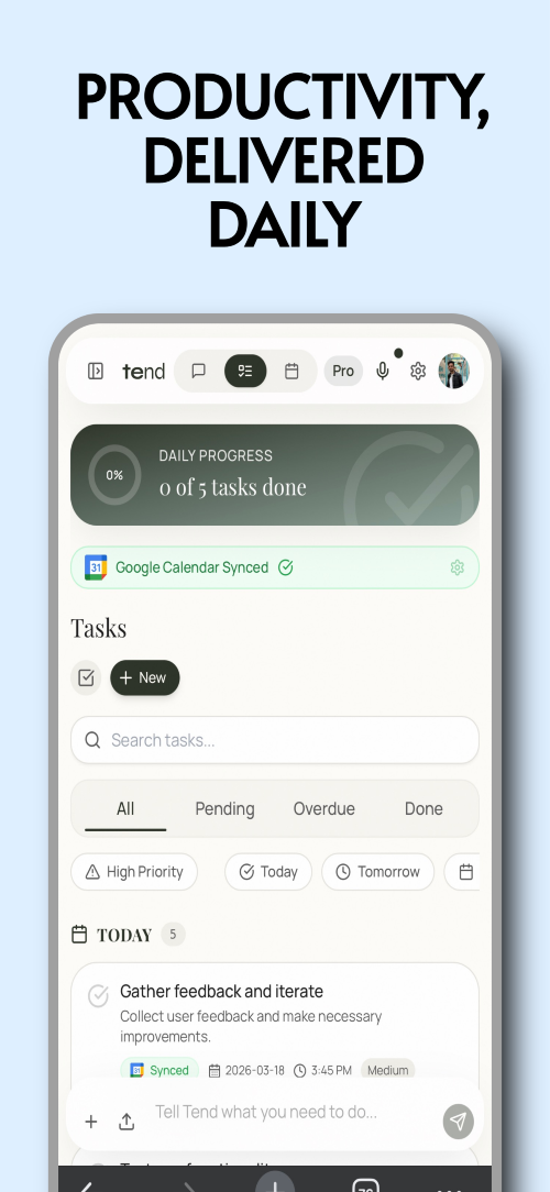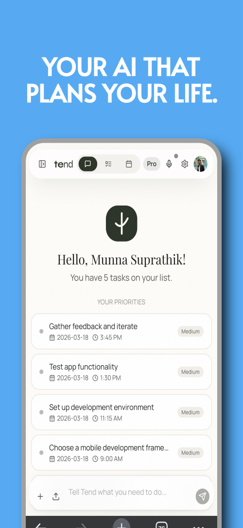Tend is an AI-powered productivity tool designed to help you turn ideas into clear, structured action plans. Instead of manually breaking down goals, you simply describe what you want to do, and Tend generates tasks, priorities, and a plan to guide your execution. It focuses on reducing the mental effort between thinking and doing. Whether you are planning a project, organizing your day, or starting something new, Tend helps you move forward with clarity and direction. With features like task organization, daily planning, and progress tracking, Tend acts as a system that supports consistency and focus, not just task management.