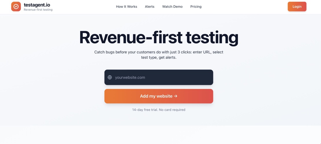 TestAgent.io is a no code QA AI testing tool that automates checking whether critical user flows on a website actually work, especially revenue impacting flows like checkout, signup, and search. TestAgent does this in just two steps. You provide a URL, and TestAgent generates and runs the tests for you. Non technical teams like marketing can use TestAgent to create, schedule, and run QA tests. What it does: * Automated website testing: Paste in a URL and TestAgent simulates real user interactions like clicking buttons, filling forms, and moving through flows to verify they work. * Monitoring: Continuous monitoring through scheduled and repeated tests. * Alerts and reporting: If something fails, you are notified so you can fix issues before you lose revenue. TestAgent.io helps protect fast moving, loosely tested products from breaking in production. In a vibe coding world, where teams ship quickly, change flows often, or rely on AI generated code, it continuously checks real user journeys like signup, checkout, or onboarding and tells you when something stops working, without you writing or maintaining a single line of test code. This allows teams to move fast with confidence, catch issues before users do, and avoid silent failures in critical parts of their product.