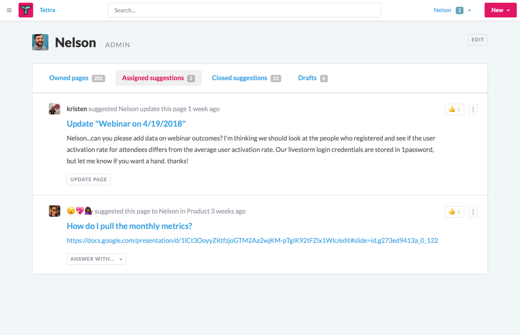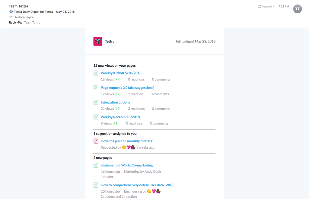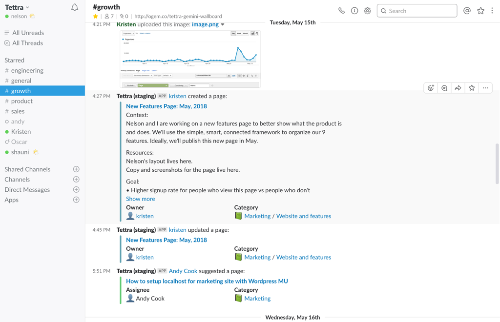 -Better organization with a centralized home for resources -Let everyone contribute to documentation and sharing -Answer repetitive questions quickly in Slack -Find out what you need to add or update -See what content is most useful for teammates -Keep documents up-to-date automatically -Stay on Top of Changes with Notifications in Slack -Save Time with Templates -Automate documentation with integrations