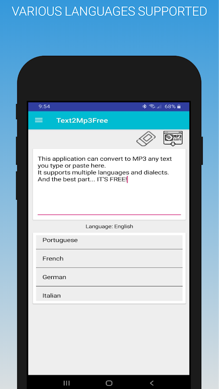 Text2Mp3Free is a free Android app that converts text to Mp3, Ogg and Wav. The app can convert text from different languages: - Spanish (Spain). - Spanish (Mexico). - English (USA). - English (GB). - Portuguese. - French. - German. - Italian. - Japanese. - Rumanian. - Russian. You can use Text2Mp3Free to convert text into audiobooks, create audios for podcasts and video narrations, or simply convert any text you want to hear into audio.