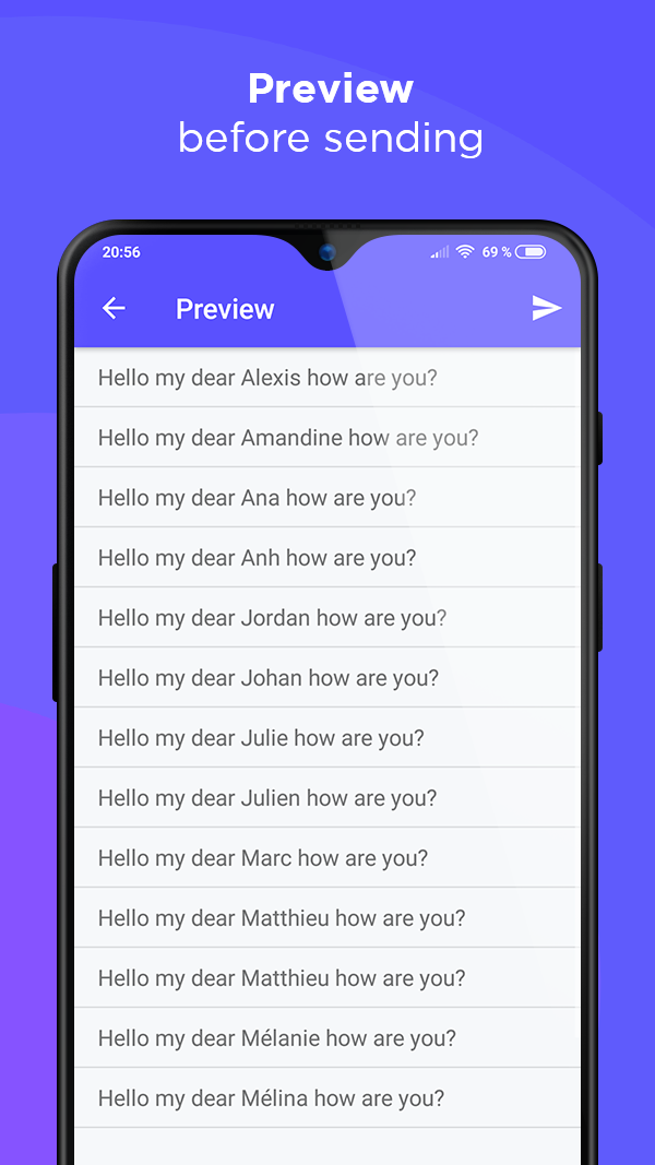 TextBlast is perfect for SMS marketing and communication. Send customized messages in 4 steps: 1. Write your message 2. Select your contacts 3. Preview 4. Send each message