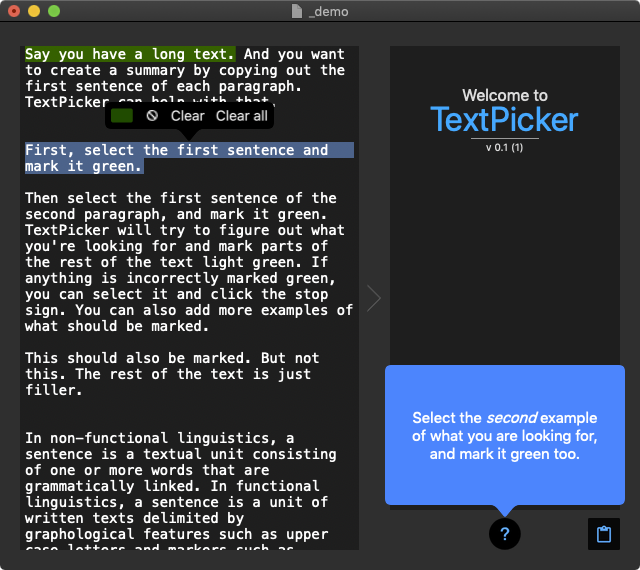TextPicker is an application for automatically copying out parts of a text. You show it examples of the type of text you are looking for, and it selects other parts of the text that are similar. You can tell it what it got wrong, and provide further examples. When you are satisfied with the pattern you and TextPicker have discovered, you can export it and use it as a stand-alone Mac application, from the command line, in an Automator workflow, as a macOS service or a web API. Or from your own code if you are a developer.