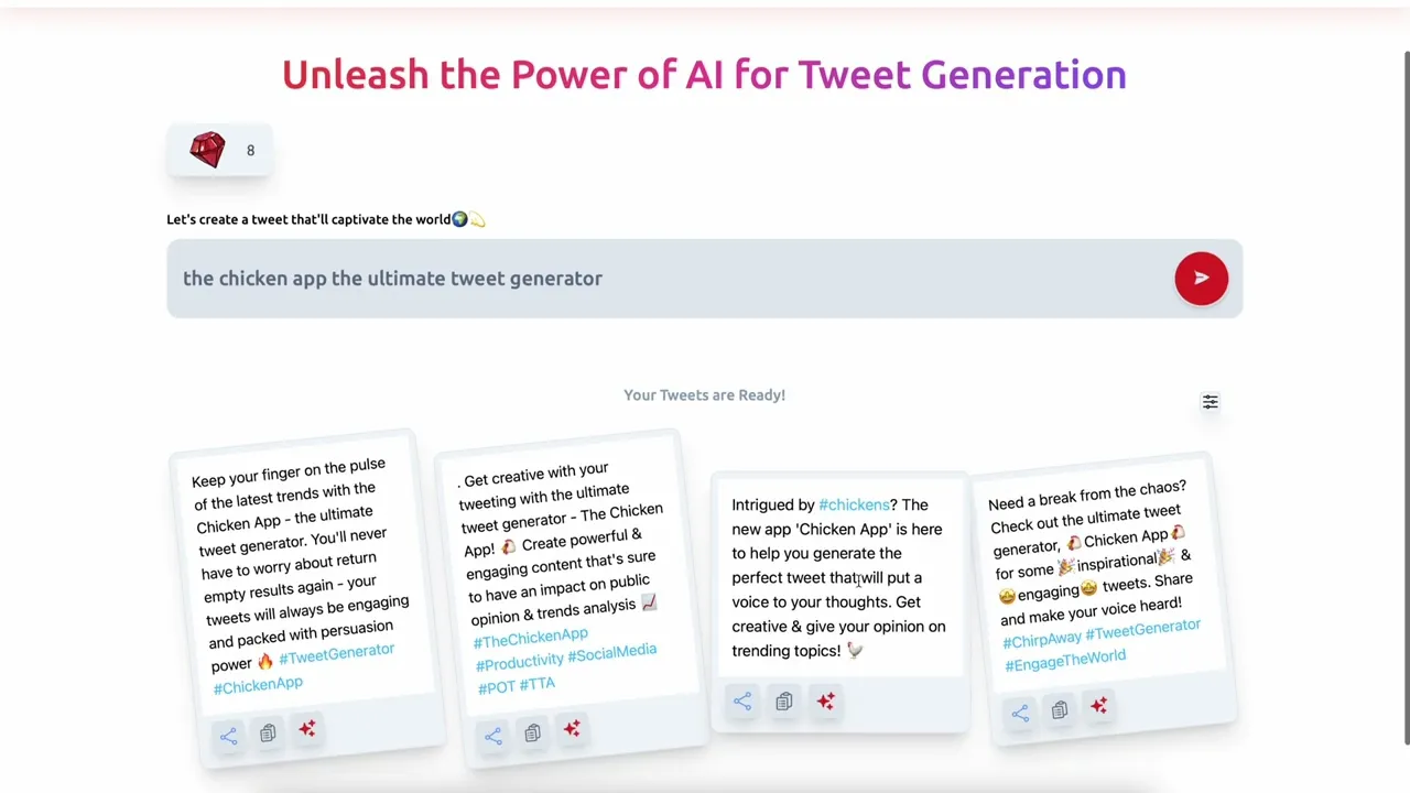 Introducing ChickenApp: Your Ultimate AI Tweet Generator! With ChickenApp, effortlessly generate engaging and captivating tweets using cutting-edge Artificial Intelligence. Unleash the power of AI to craft compelling and on-point tweets for your social media campaigns, personal branding, or business promotions. Say goodbye to writer's block and hello to endless tweet ideas! Elevate your social media presence with ChickenApp today.