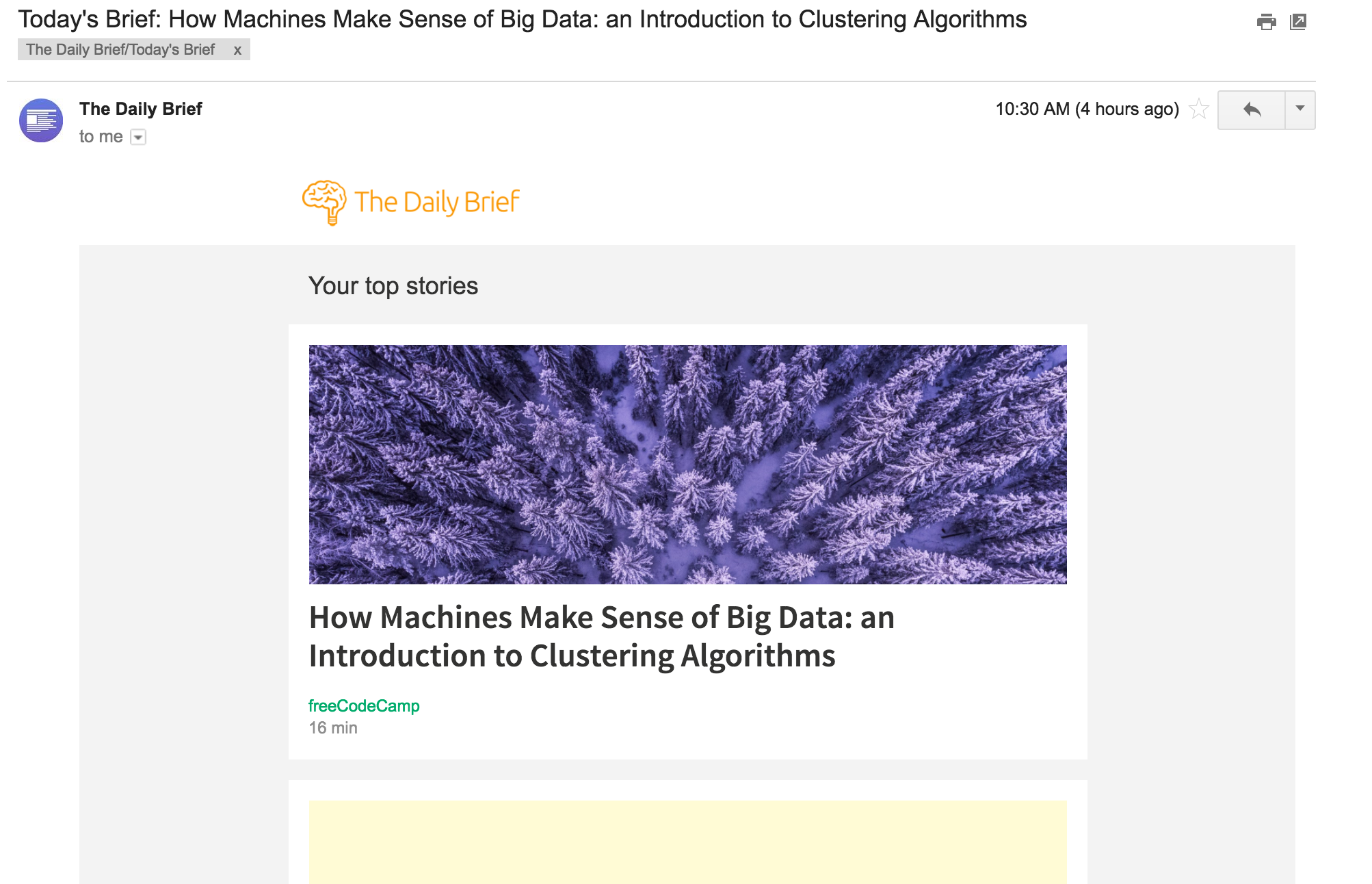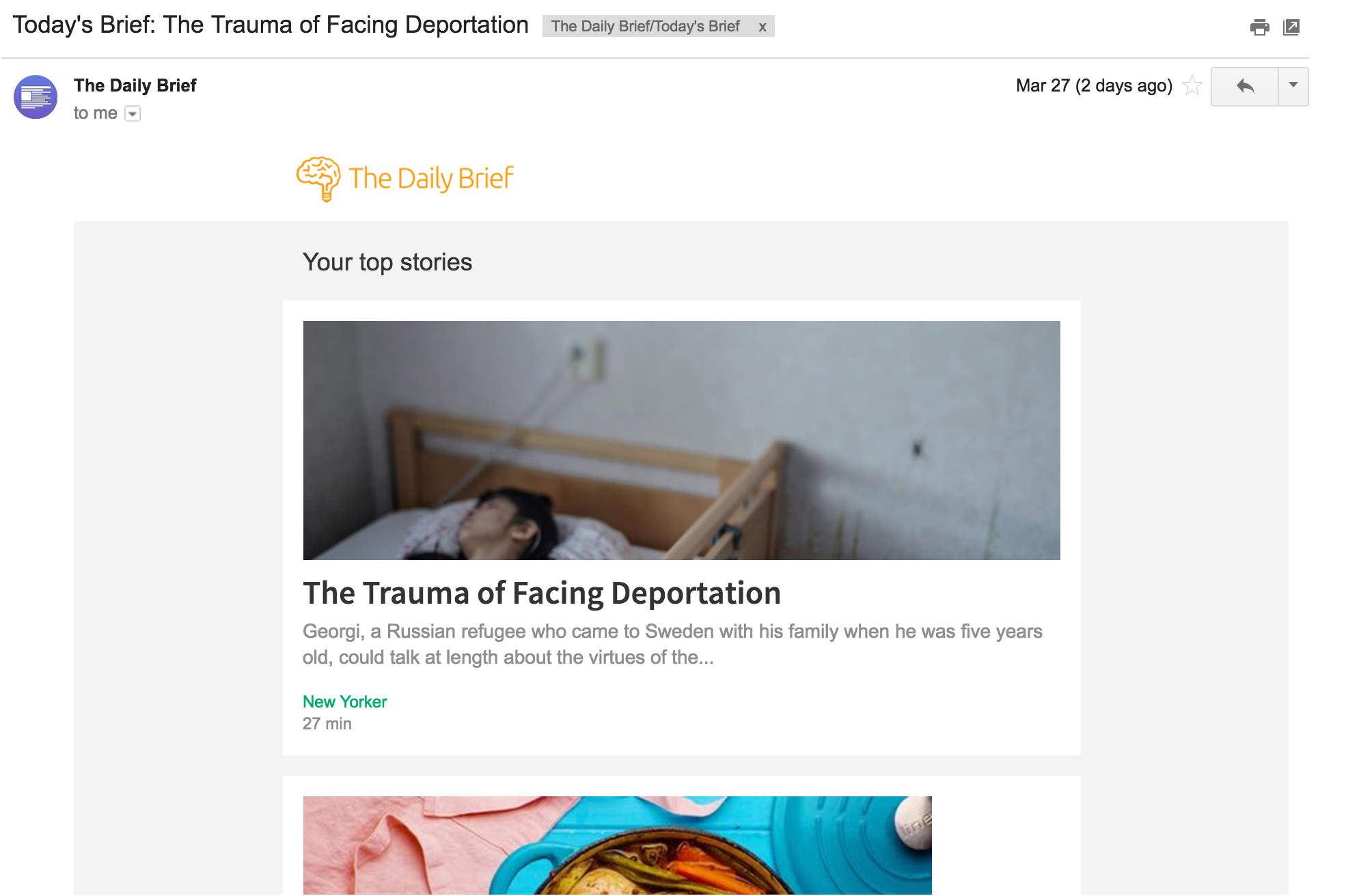 The Daily Brief curates longer form articles and podcasts from high quality, handpicked sources, and provides users a clean, simple website and newsletter in which to consume them. The newsletter highlights the most interesting stories both generally and by topic in one email delivered daily or weekly. Once you select your topics of interest, you can then sit back and enjoy reading/listening to the best stories of the day.