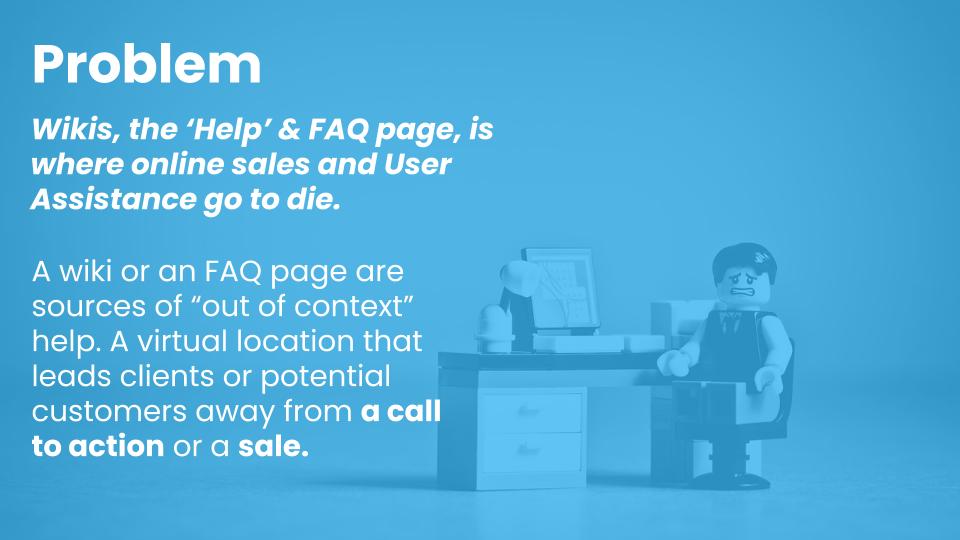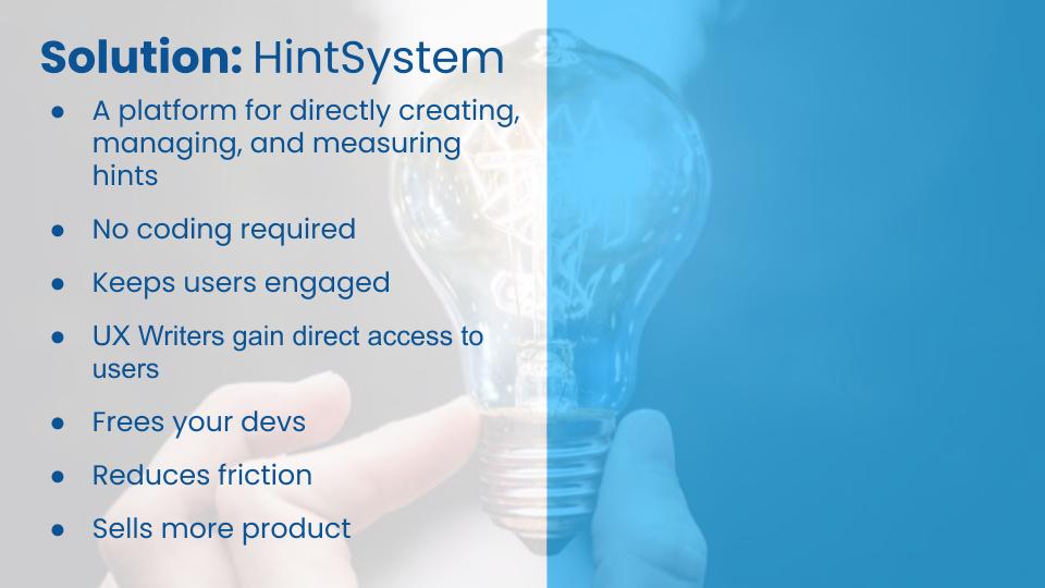 The Hint System is designed to help non-technical talent and team members participate in website and app creation by providing a simple system to integrate User Assistance tools into the User Experience. Problem: Wikis, the ‘Help’ & FAQ page, is where online sales and User Assistance go to die. A wiki or an FAQ page are sources of “out of context” help. A virtual location that leads clients or potential customers away from a call to action or a sale. When it comes to money, that’s a BIG problem. Many people look for answers about the features of a product and end up having to hunt them down somewhere else on the site. The moment people leave the product page, is the moment where you will most likely lose the sale. That’s where HintSystem comes in… by providing “hints” (answers) to your client’s and customer’s questions in the moment AND in the right location. The HintSystem is a plugin for directly creating, managing, and measuring hints. No coding required. It keeps users engaged and reduces friction allowing you to sell more product. It's easy to use. Your team member can add a hint to ANY website the HintSystem is attached to by simply using a browser plugin. Once the system has been added to a site, it only takes a few seconds. ANYONE on your team can hop onto the site, open the browser plugin and add a new hint, interactive tooltip or widget. All tools you can use through the HintSystem to help you keep customers on your site and increase sales.