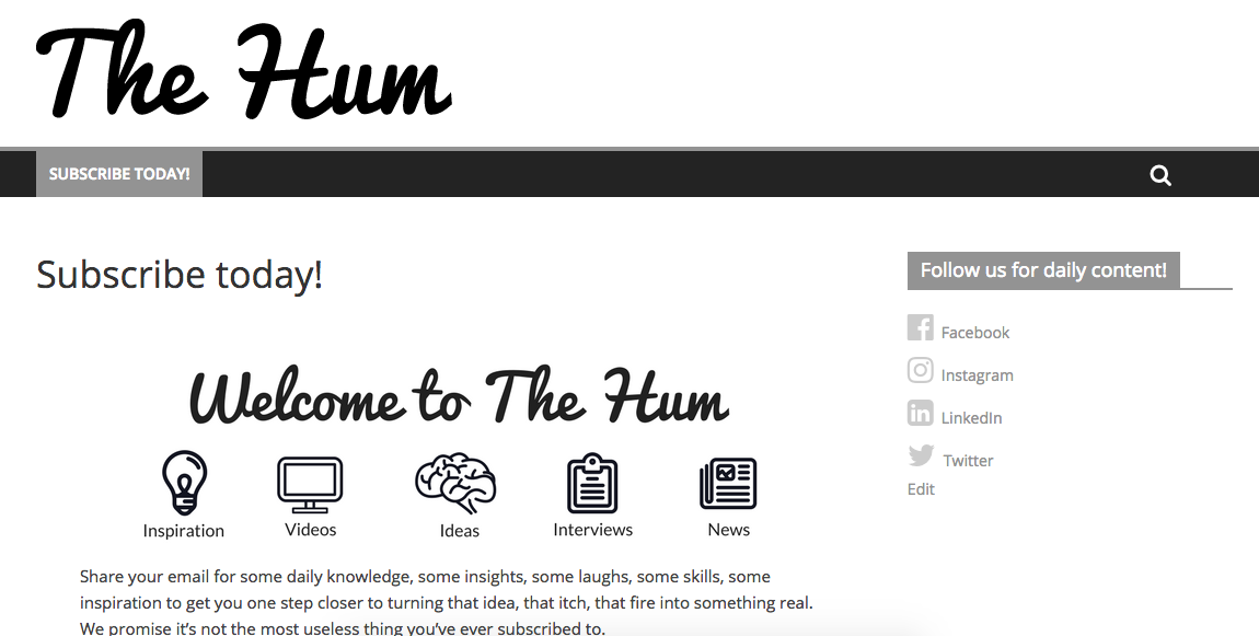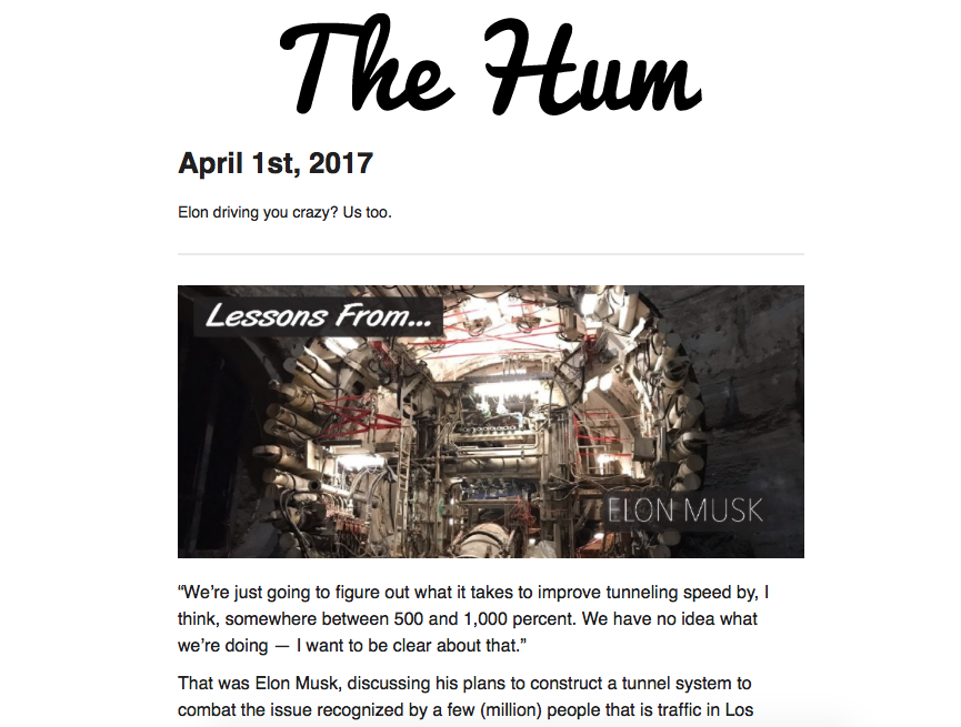 The Hum was founded January of 2017 by David Powers. David saw a need for a website that hosted resources for young entrepreneurs who want to create their own business’. Dave put together a team of young business professionals who have very different experiences to be able to bring to light many of the issues that may not always be talked about. Balancing school, family, friends, work, and relationships can be tricky, so receiving all the help you can is critical in creating a network that will help you achieve your dreams. We send out a daily email with content catered to young entrepreneurs, from guest articles, resources on how to better your business, videos, suggested articles, all with a laid back attitude! Our mission is to show that entrepreneurship isn't some scary monster, want to learn more? Visit our site, sign up for our mailing list, and don't be shy! The fun starts April 1st, 2017! Thehum.co