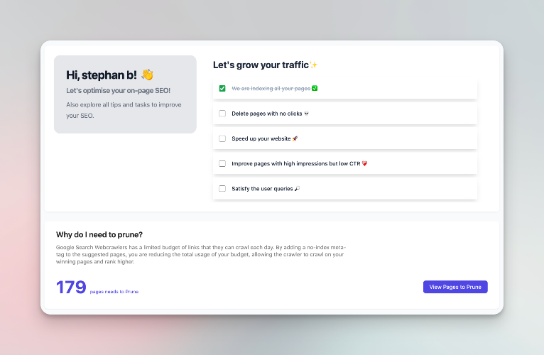 We fix your website and double your traffic in 3 months. Most growth potential of website's is in the on-page SEO optimisations. We automatically index your pages, we find pages you should better prune (because they get no clicks), we show you how to speed up your page and much more. Past user have seen a doubling in organic clicks in 3 months.