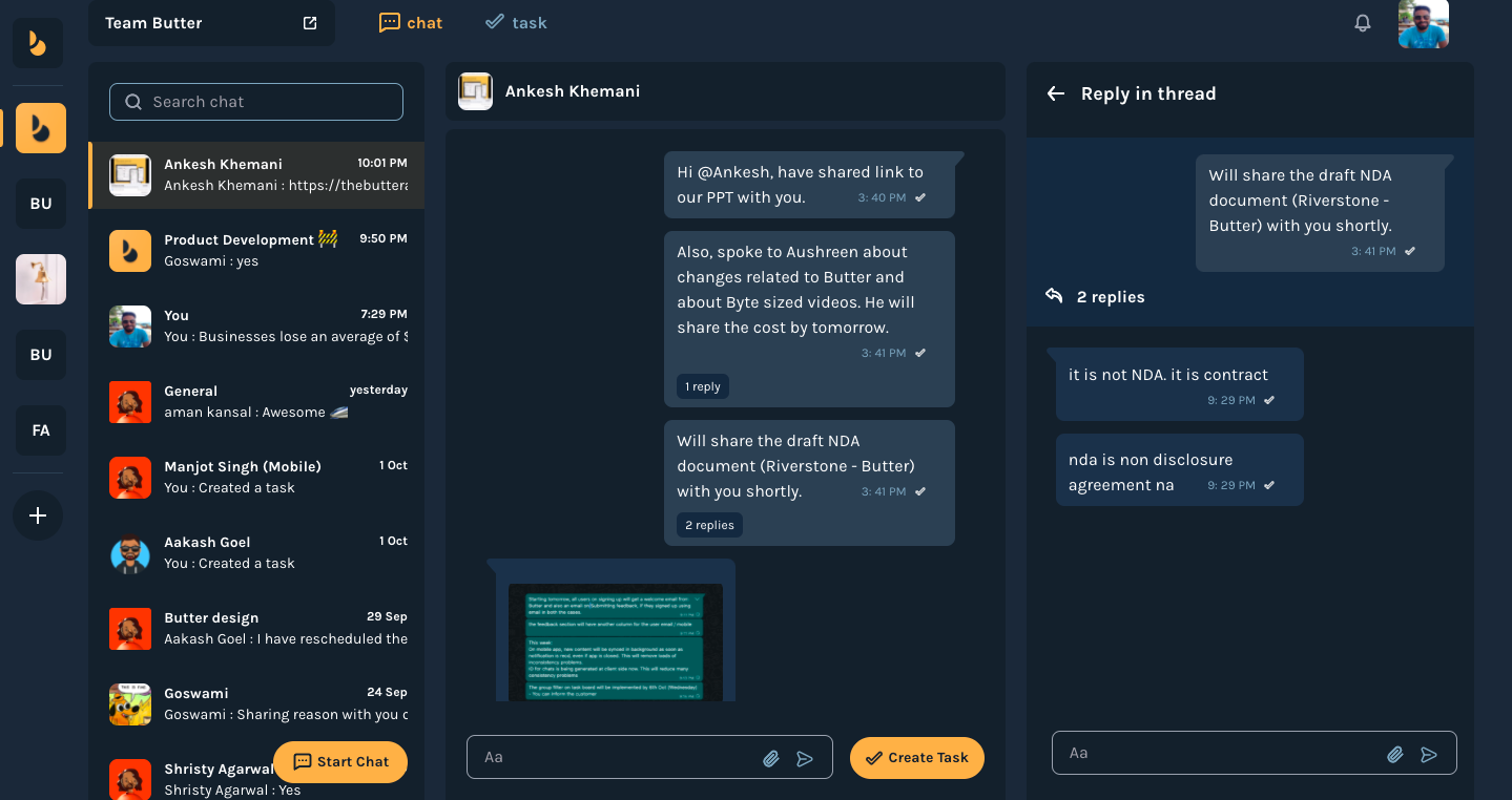 At Butter, we have made a simple mobile-first team collaboration app that combines communication & task management, made for the next billion knowledge workforce. We make teams more productive by saving their time and cognitive effort which goes into using multiple apps. With Butter, create an unlimited workspace, add unlimited team members, send unlimited chat messages, assign unlimited tasks. I give the flexibility to join Butter via Email ID or Mobile number. Links of Butter app - https://www.thebutterapp.com/ Playstore - https://lnkd.in/emv_C2Vd Appstore - https://lnkd.in/e3tuuhNe Web app (For PC) - https://lnkd.in/erVKKsvf