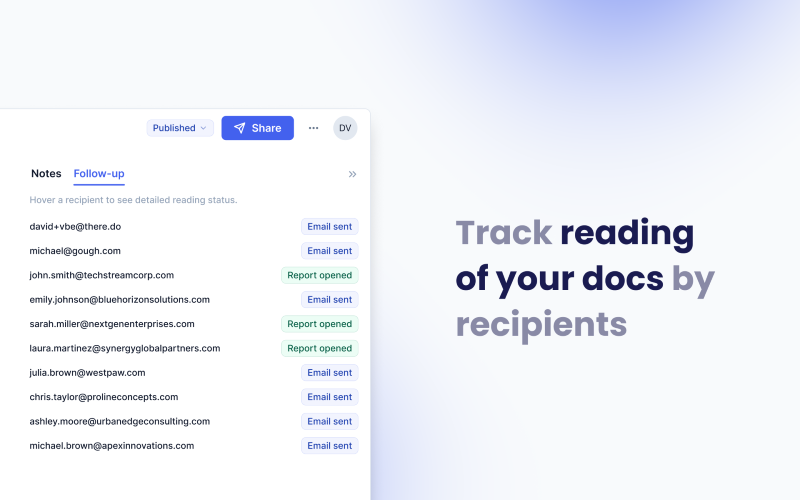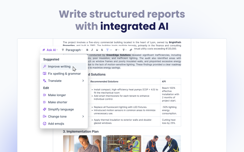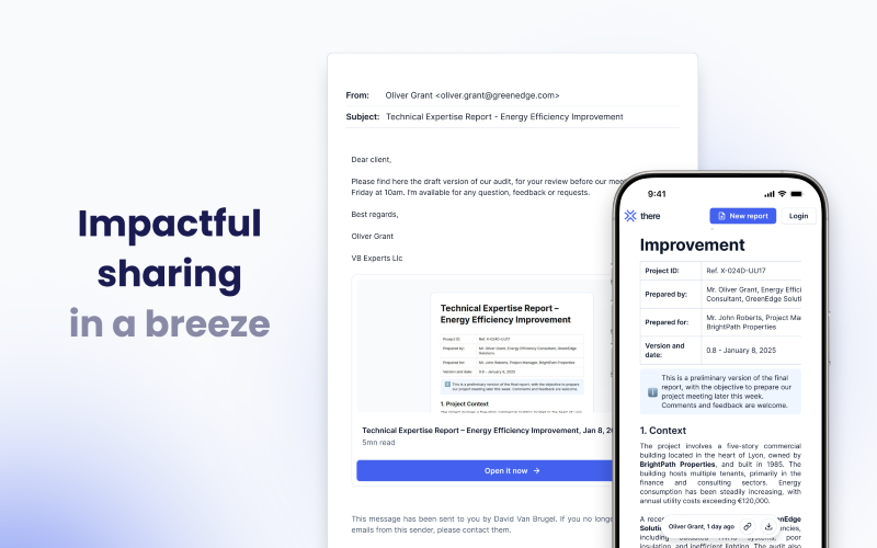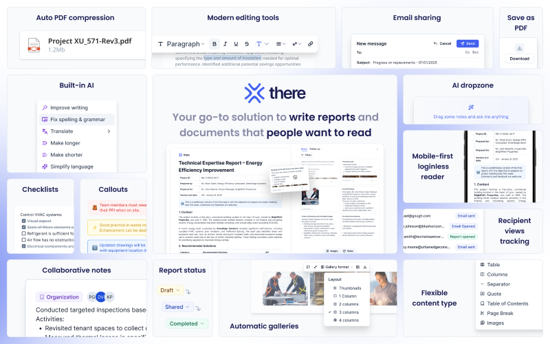there is the place for your next report. — Optimize report preparation, with easy importing, formatting and sharing, using AI to reproduce your style and simplify this process for you. Stop using Word, OneNote, ChatGPT, iLove PDF and DocSend and start using there, a single app to write and share impactful documents and reports.