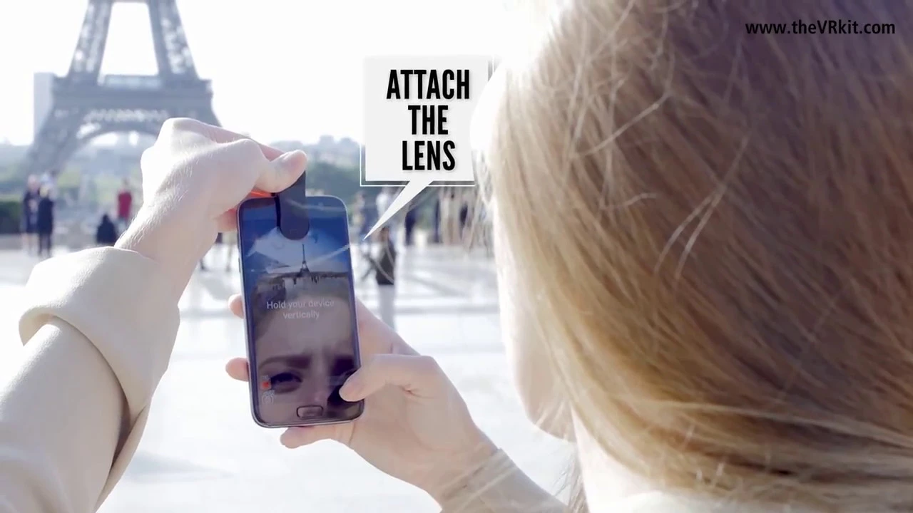 theVRkit is a software/hardware kit that uses your smartphone camera to capture high resolution 360 spherical images in an automated way: - a clip-on fish-eye, specially designed with clarity and sharpness to extend your phone camera field of view - a Bluetooth controlled electronic mount that spins the phone and stops to take images in all directions - plastic foldable VR glasses to enjoy the result in VR through your phone screen - a free app (theVRkit on iOS and Android) to stitch the images instantly