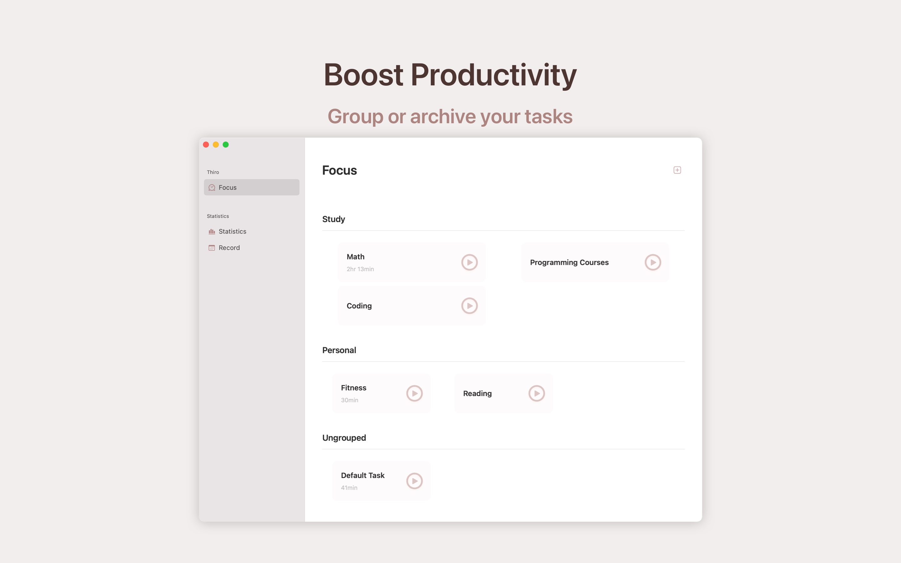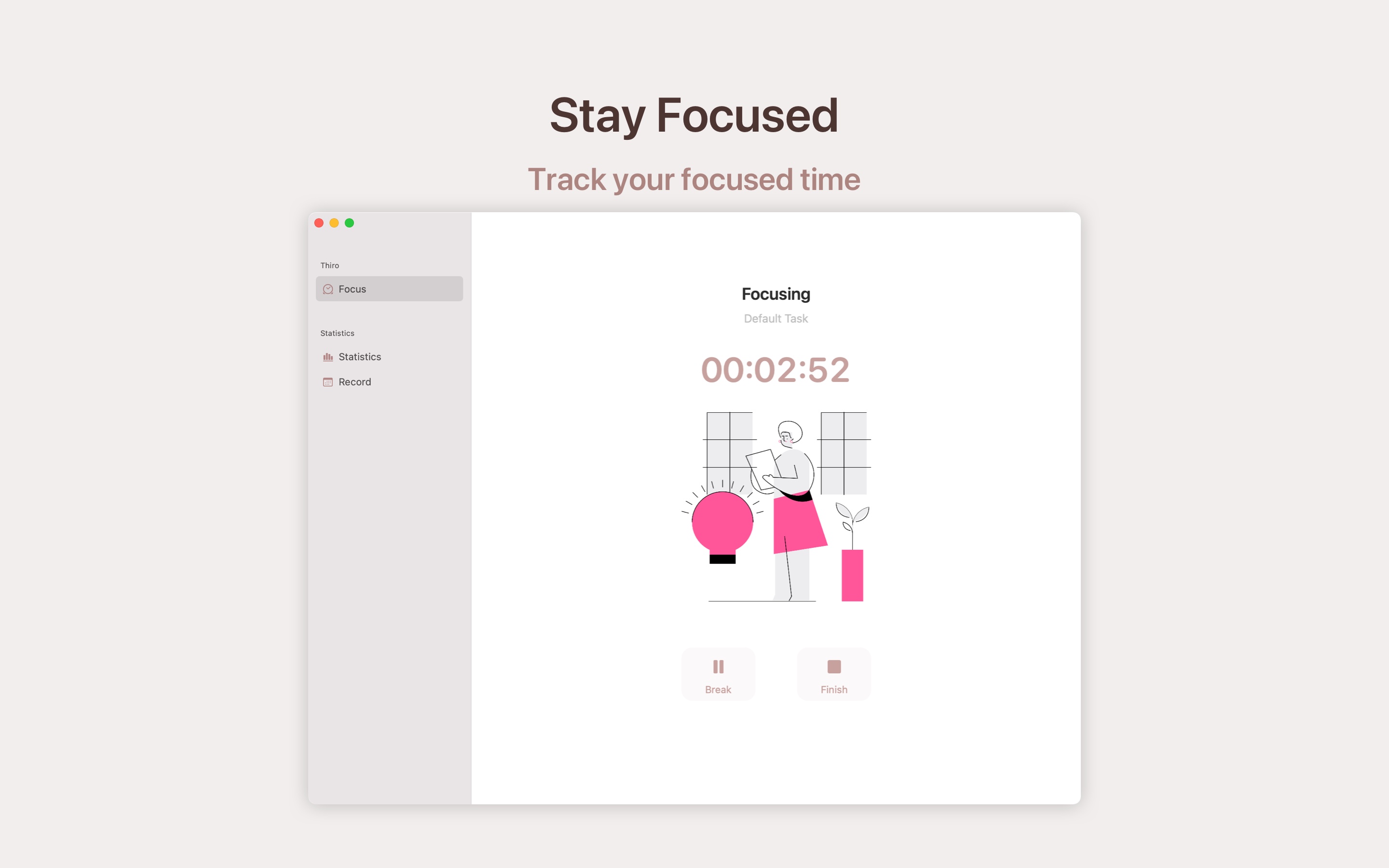 Thiro is a focus timer that helps you focus on everything you do. It helps you concentrate on tasks in your study and work by tracking the time you spend on each task. STAY FOCUSED: - Keep track of each of your focus sessions as a timer or manually add a period of focus time. - Set daily/monthly/yearly goals for your tasks and keep moving forward. - Manage tasks in groups to keep everything in order. - Archive finished tasks to help you focus more on your work or study at the moment. - View detailed statistics of your time distribution. FOCUS EVERYWHERE: - Seamlessly use Thiro on your iPhone, iPad, Apple Watch and Mac. Sync across all your devices using iCloud. - Just start a focus session on one of your devices, and it will be seamlessly synced to all your devices. MORE THOUGHTFUL FEATURES: - Night-owl Mode: Records between 0:00 and 4:00 will be counted in the previous day's statistics. Statistics will not be interrupted even if you stay up late working or studying. - Zen Mode: Accompany your work or study as a desktop clock. - Turn over to Start: Turn the phone over to start a focus session. - Widgets: View your statistics on the home screen. - Siri & Shortcuts: Track your focus in a more automated way.Thiro is a focus timer that helps you focus on everything you do. It helps you concentrate on tasks in your study and work by tracking the time you spend on each task. STAY FOCUSED: - Keep track of each of your focus sessions as a timer or manually add a period of focus time. - Set daily/monthly/yearly goals for your tasks and keep moving forward. - Manage tasks in groups to keep everything in order. - Archive finished tasks to help you focus more on your work or study at the moment. - View detailed statistics of your time distribution. FOCUS EVERYWHERE: - Seamlessly use Thiro on your iPhone, iPad, Apple Watch and Mac. Sync across all your devices using iCloud. - Just start a focus session on one of your devices, and it will be seamlessly synced to all your devices. MORE THOUGHTFUL FEATURES: - Night-owl Mode: Records between 0:00 and 4:00 will be counted in the previous day's statistics. Statistics will not be interrupted even if you stay up late working or studying. - Zen Mode: Accompany your work or study as a desktop clock. - Turn over to Start: Turn the phone over to start a focus session. - Widgets: View your statistics on the home screen. - Siri & Shortcuts: Track your focus in a more automated way.