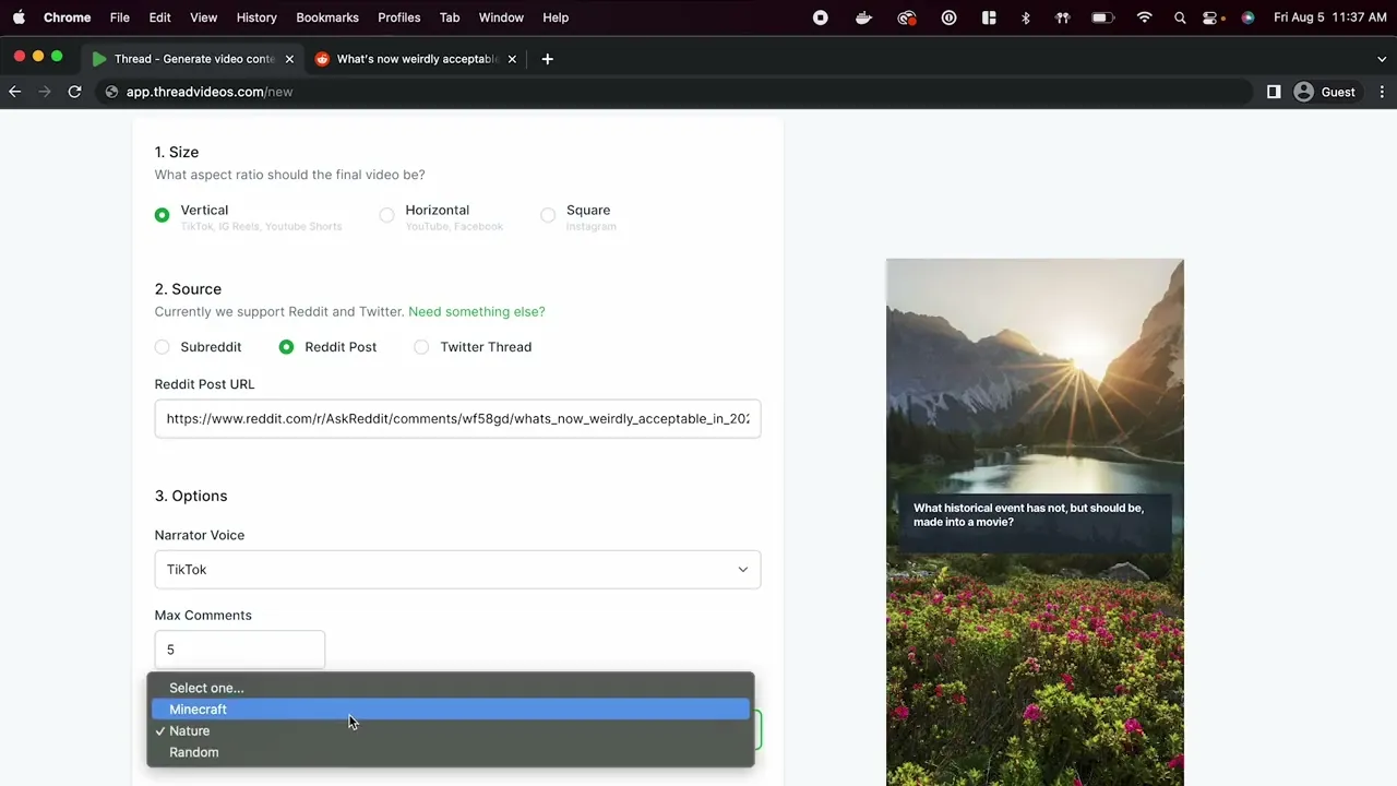 Thread is a platform that automatically generates social media videos based on text threads from Reddit, Twitter, and more. Choose a subreddit or hashtag, or paste a link to a post, and Thread will automatically generate a highly-watchable video ready to post to TikTok, YouTube, Instagram, Facebook, or anywhere!