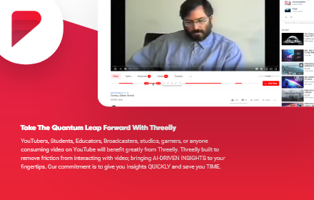 Unlocking Insights from Videos with Artificial Intelligence Threelly AI unlocks 80% of insights in videos that often go unnoticed like - topics, scenes, people, sentiments, brands, expressions, labels, Visual text (OCR), known graphics & logos and much more. https://chrome.google.com/webstore/detail/threelly-smartview-for-yo/dfohlnjmjiipcppekkbhbabjbnikkibo/ Threelly A.I. algorithms automatically analyze your video for key topics, keywords, scenes, people in the video, sentiments, brands, translation and much more. Allowing you and your user base to rapidly gain intelligent insights. Some have called it "A quantum leap forward in video viewing", "a game changer for youtubers", "a radical shift in the video viewing paradigm". https://www.youtube.com/watch?v=4rQjL8Vxrao