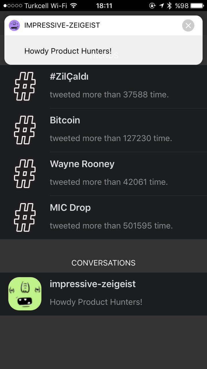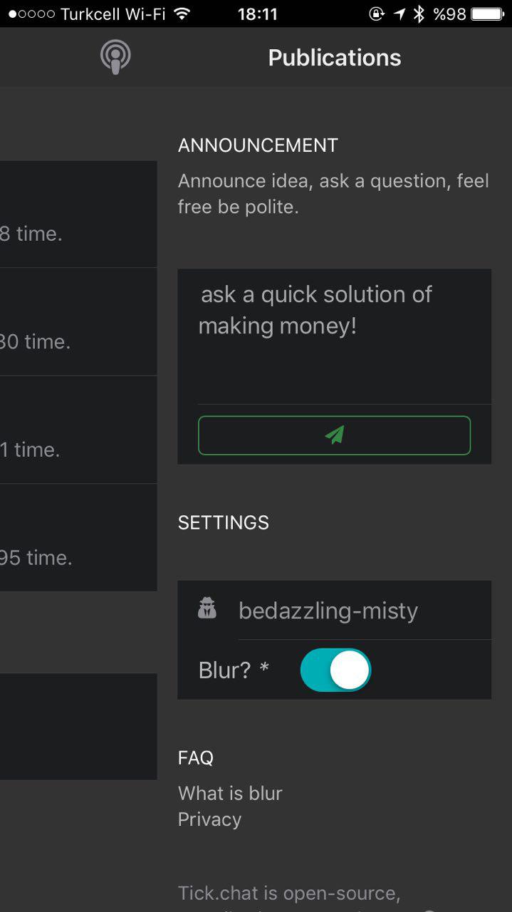 The app, allows people to chat with others in the same area with anonymously. This app alike snapchat for ideas. You can chat others with same trend topic, snap ideas, even ask a question to the whole country!