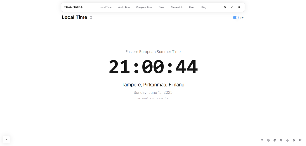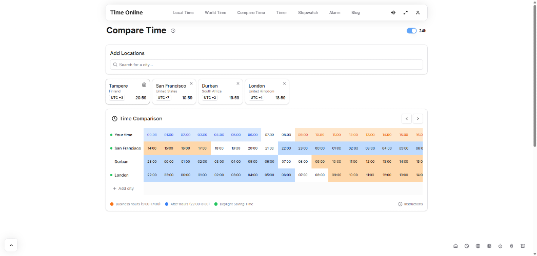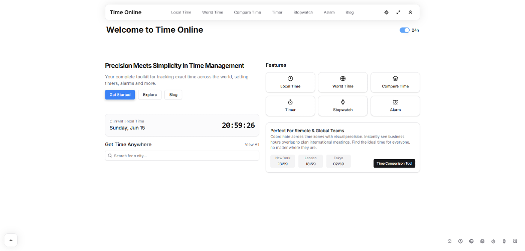 Time-Online is designed to simplify time management with an array of online tools to help you stay on track, no matter where you are. Whether you need to compare world times, track events with a stopwatch, or set a precise alarm, Time-Online provides you with the tools you need to manage your time effectively. It's an essential resource for professionals working across time zones, travelers keeping track of local times, and anyone looking to maximize productivity with easy-to-use timers and alarms.