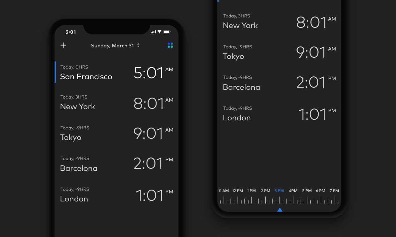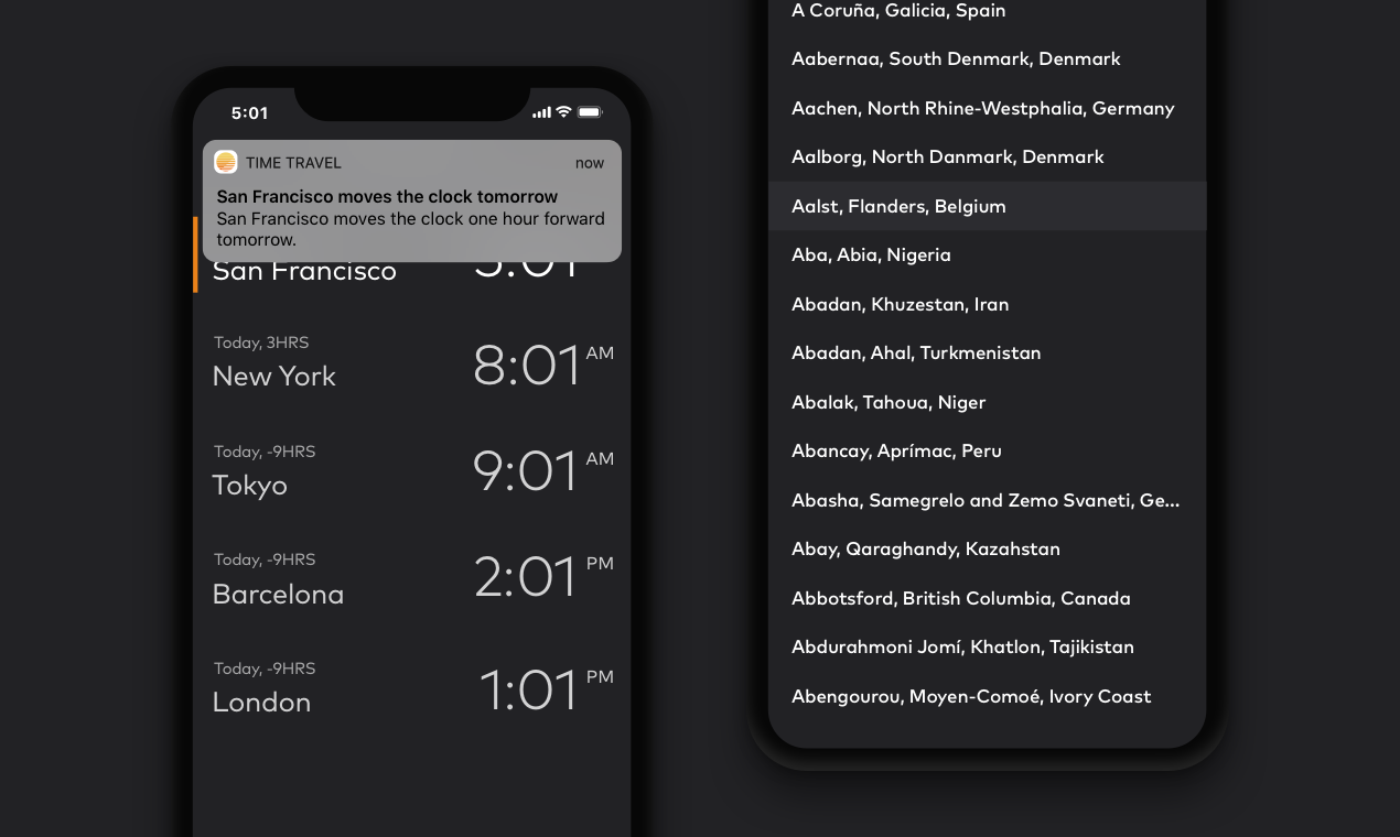 Time Travel makes working with timezones easy and fun. - Jump back and forth in time and see the current time in different cities. - Choose from multiple themes and colors. - Get notifications a day before any city from your list moves the clock.