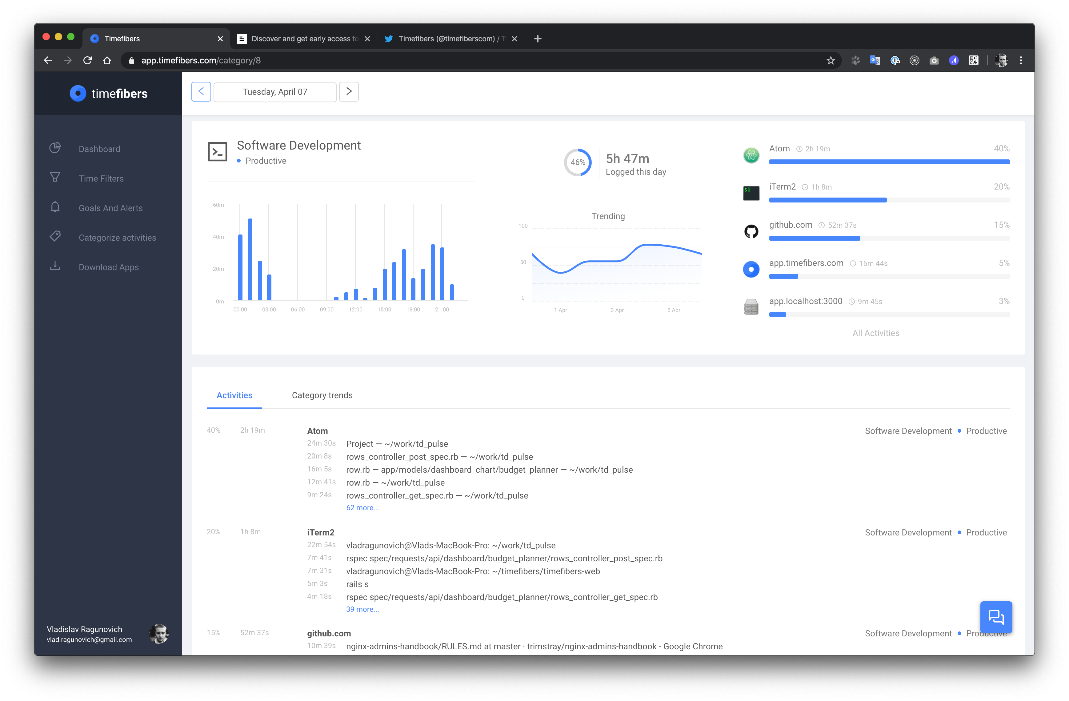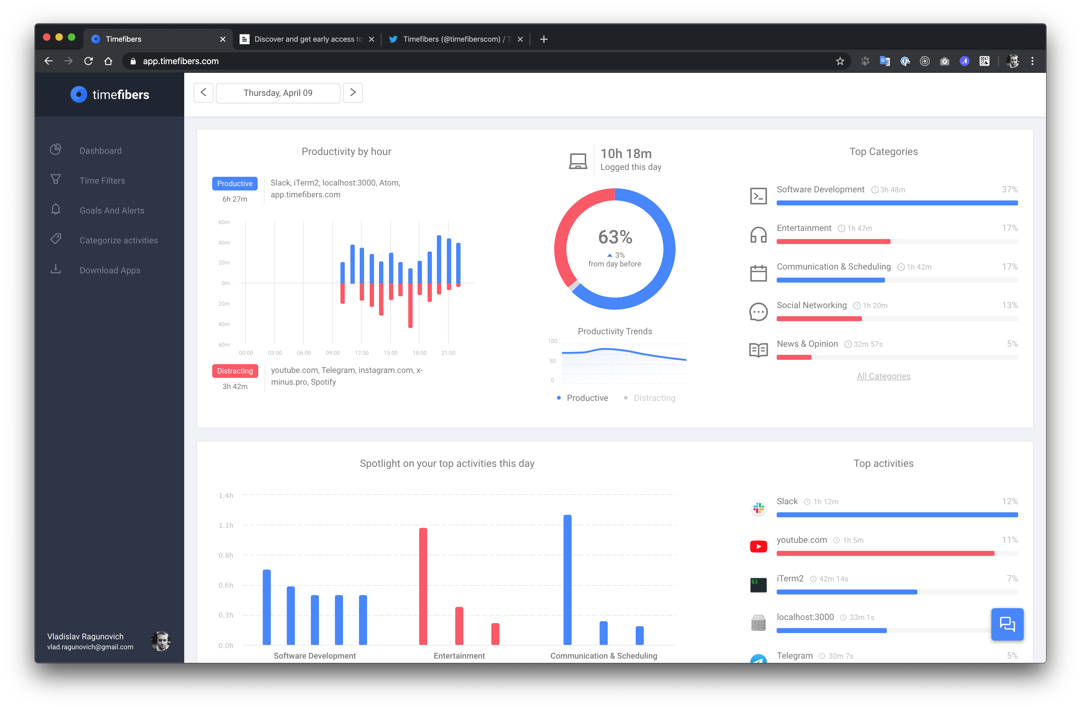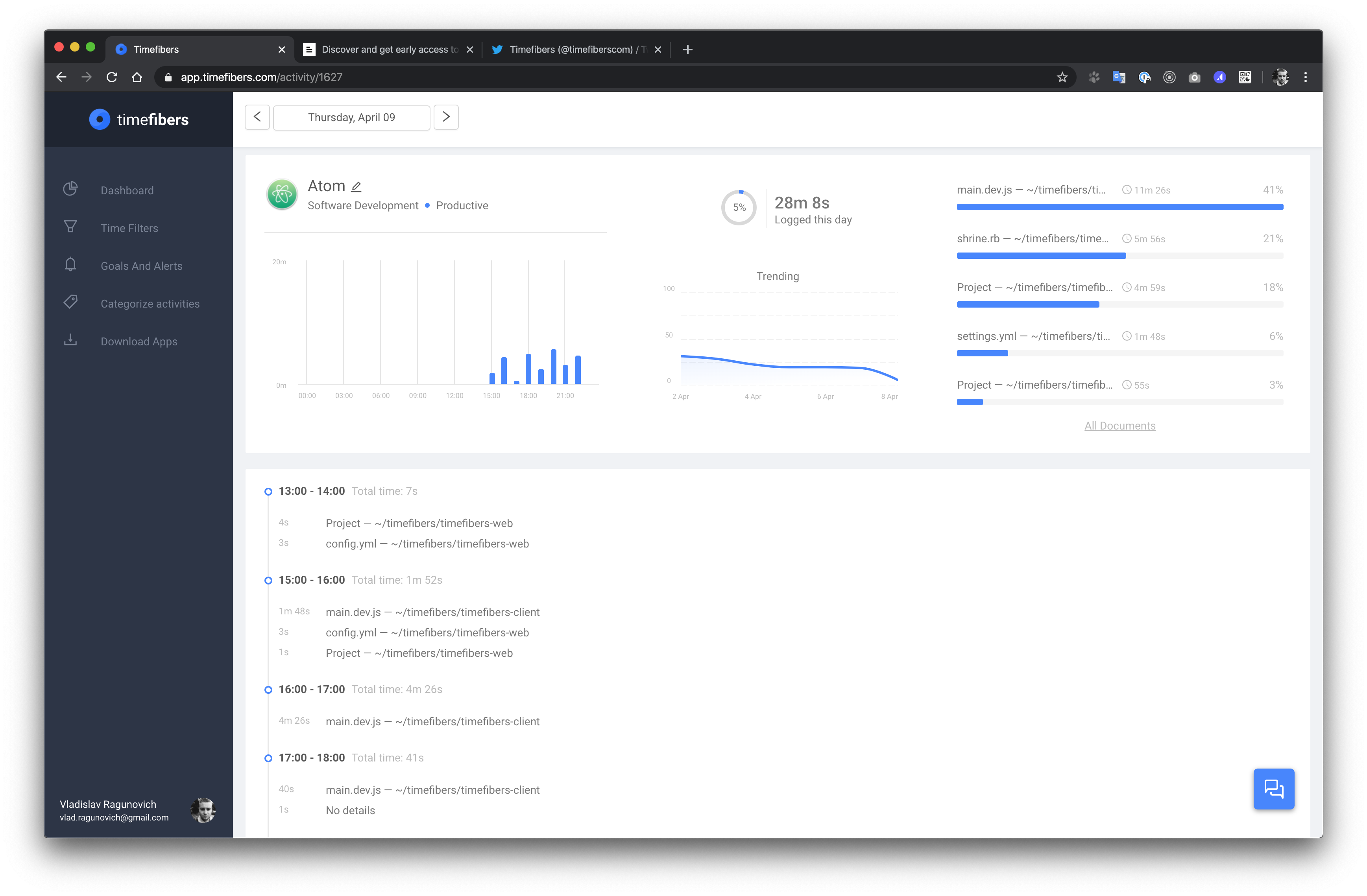 Timefibers is automatic website and app tracking tool. Everything you do is automatically categorized so you can quickly see the time you spend on specific apps, websites, and projects and gauge your daily productivity.