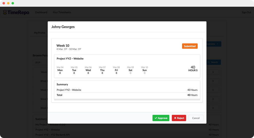 TimeRepo is a cloud-based service tailored for businesses that need to keep track of their employee's hours. For example, as a business, you can leverage TimeRepo to keep track of how many hours your employee's spend working on a business project or client. This allows you to measure how much time is going into each business project or client and aligning this information with the progress being made can help your business figure out where inefficiencies are as well as bottlenecks. In regards to how TimeRepo works, it is quite simple. It involves having the employee report (on a weekly basis) how many hours they worked and what they were working on. It is then the responsibility of an employee's manager to review the submitted 'weekly timesheet' and approve or reject it based on it's accuracy.
