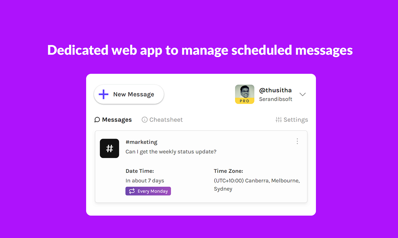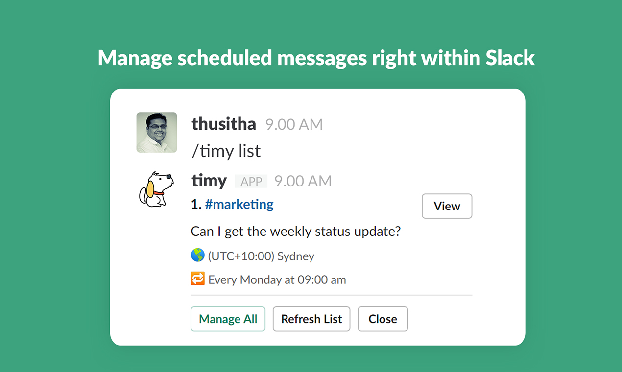Timy is the best way to send scheduled messages in Slack. Ideas doesn't always have perfect timing. So it's valuable for both sides to be able to mentally offload, as well as not disturbing your teammates at all hours. Timy will help you to stay focused and that's why it's already trusted by more than 3000 organizations around the globe including Shopify, Dropbox, Epic Games and more. Some of the key features include, • Send recurring messages (Every weekday, Every month...) • Send unlimited messages in any time zone. • Maximum schedule time limit of one year. • Save time zone mappings for each user or channel. • Pause recurring messages if you are away. • Attach files to scheduling messages via web app. • Edit/Clone scheduled messages. • Get Slackbot notifications for scheduled messages. • Dedicated Timy web app to manage your messages. Timy is the only affordable and feature rich scheduling application you can find in the Slack app store today. Hope you'll enjoy Timy and your ideas and suggestions are welcome! Start free on https://timy.website