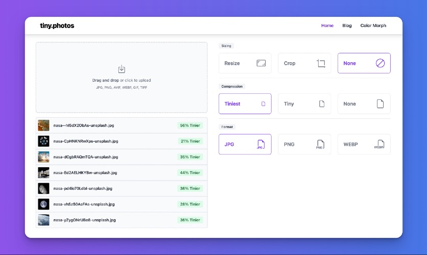 Process images in bulk securely in your browser, no uploading necessary. It's private, fast, and easy! Upload all major image formats, resize, crop, compress, and convert images all at once.