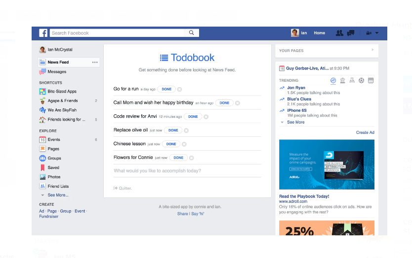 Turn the Facebook News Feed into a todo list so you can stop wasting time and start getting things done. Once you've completed all your todos you can use News Feed again. If you need a break, you can disable Todobook for the day via the Todobook icon in your browser's toolbar. Todobook does NOT access, read, edit, or store ANY of your data on Facebook, and never will. And it will NEVER post anything to Facebook on your behalf.