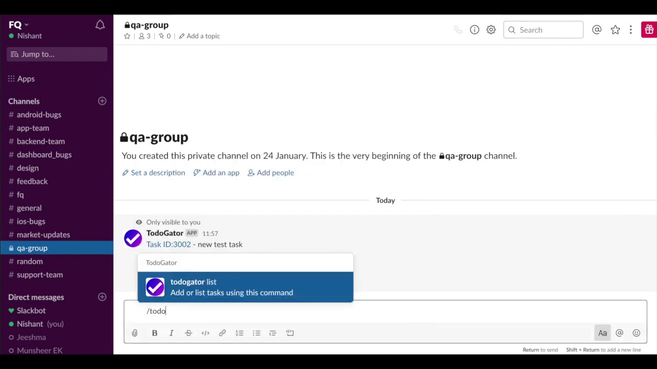 TodoGator is an issue tracking application for teams on Slack.? TodoGator helps you track tasks, bugs and manage projects more efficiently. It is simple, yet packed with great features for teams to get work done faster. Feature Highlights: Add tasks from Slack You can add tasks to your team-mates directly from Slack using slash commands. You can also click on the menu for any message and convert it into a task. You can also update status, add priority, description etc all from Slack itself. Custom workflow Every team follows a different workflow when it comes to managing projects. On TodoGator, you can customize the workflow to meet your team's needs. Slack notifications - Whenever a new task is added or a status updated by a team member, you can get notified. This is fully customizable for each space within your workspace. Spaces Spaces are like projects. You can create any number of spaces to manage your projects. Within spaces, you can create any number of lists to manage your tasks. Keyboard shortcuts Add tasks, update priority, status, assignee etc all using keyboard shortcuts. We are adding more keyboard shortcuts to make your experience faster. Custom colors and labels All labels and statuses are fully customizable based on your preference. Dark mode If you love dark mode interfaces, we have that too. Pricing We have a full feature free version for upto 5 users. After that, you only pay for each additional user. Pricing is calculated on the number of users that are added to your workspace.