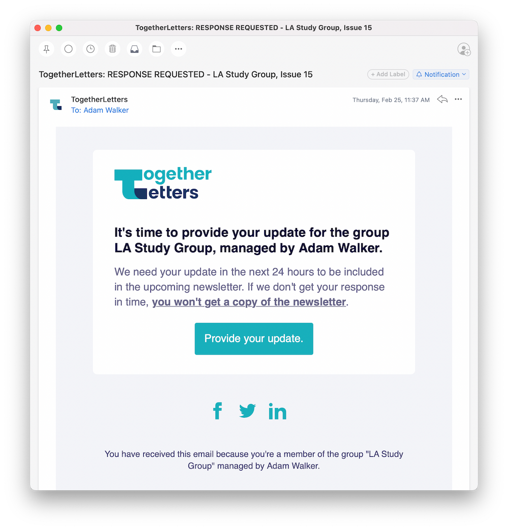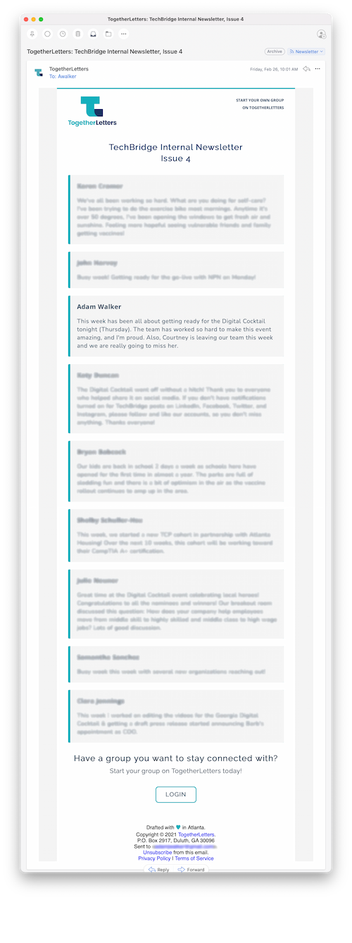 TogetherLetters helps you stay social without social media. Here's how it works. Set up a group and invite your people to start connecting. Your group will be asked for their updates. They won't need a log-in, app, or anything! We combine the updates and send them to the group in a TogetherLetter. Staying connected with the important people in your life is now easier than ever. And, groups of ten or less are always free!