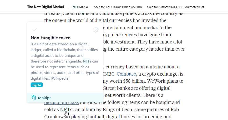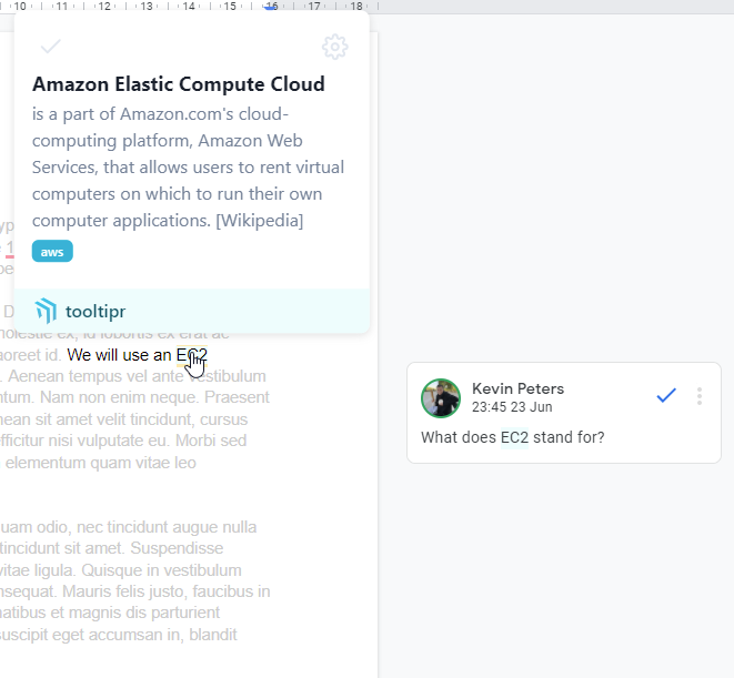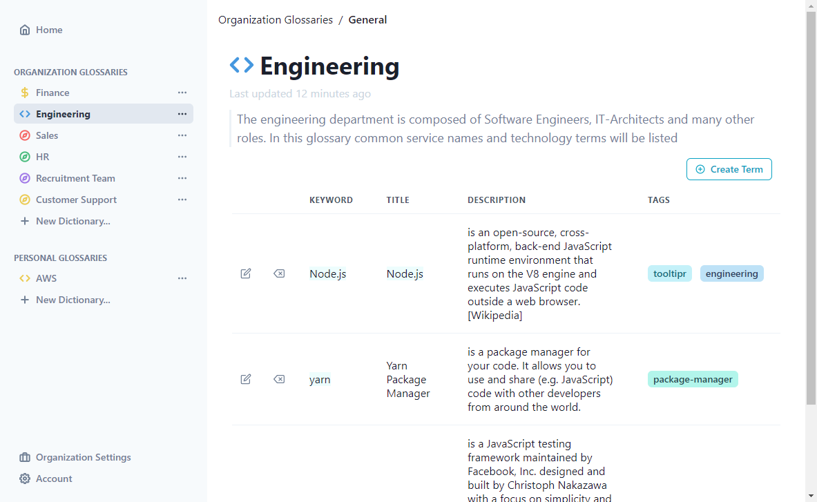 Struggling to understand the acronym in your colleague's Google Docs document? Trying to understand what the new AWS service is actually doing? In our world, we have so many acronyms, technical terms, and many other keywords that overwhelm us. tooltipr has the mission to make this easier. We offer a set of glossaries, that can be also shared in your team that holds a term and a description. Once added, we show a tooltip in the browser to whoever decides to install the browser extension, of course, privacy respected. Team dictionaries will stay in your team, the public will be public and private glossaries are just there for you!