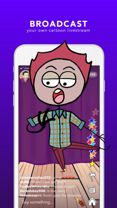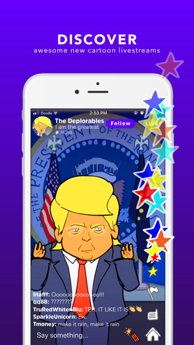 Toonstar is the place where people livestream + watch + interact with cartoon characters in a completely new way. Choose who you want to be and where you want to go, and then broadcast your own live cartoon show or make cartoon video shorts using your phone’s selfie camera. Discover awesome new characters + worlds and interact with your favorite toons in real time! Anyone…Anywhere...Go Toon Yourself!