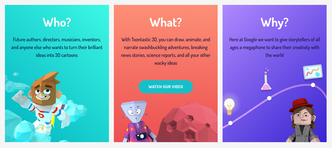 With Toontastic 3D you can draw, animate, and narrate your own cartoons. It’s as easy as play. Just move your characters around onscreen, tell your story, and Toontastic records your voice and animations and stores it on your device as a 3D video. Toontastic is a powerful and playful way to create interstellar adventures, breaking news reports, video game designs, family photo albums, and anything else you might imagine! FEATURES • A giant toy box chock full of swashbuckling pirates, transforming robots, nefarious villains, and many more characters and settings to spark kids’ imaginations • Design your own characters with 3D drawing tools • Add yourself to your adventures with photos and custom colored characters • Mix your soundtrack with dozens of built-in songs • Choose from three Story Arcs for digital storytelling (Short Story, Classic, & Science Report) • Export videos to your Photos library to share with family and friends • An idea lab chock full of playful stories, characters