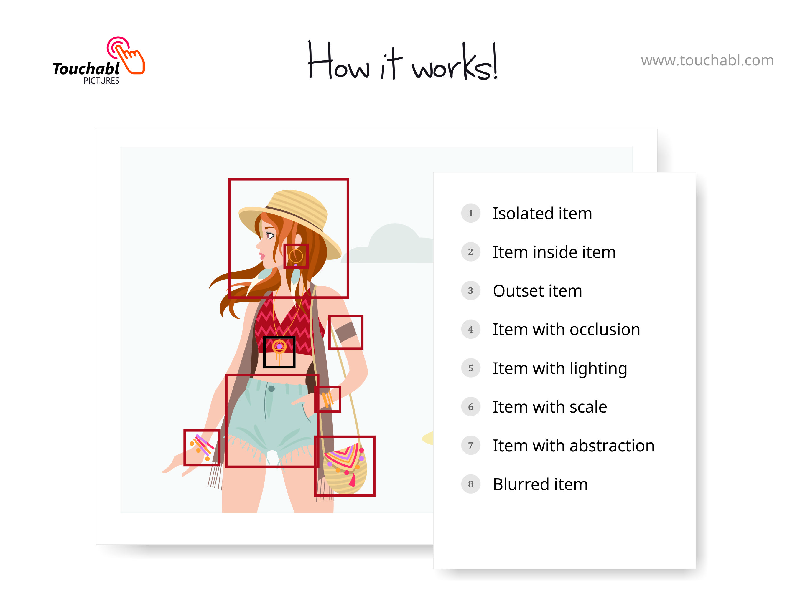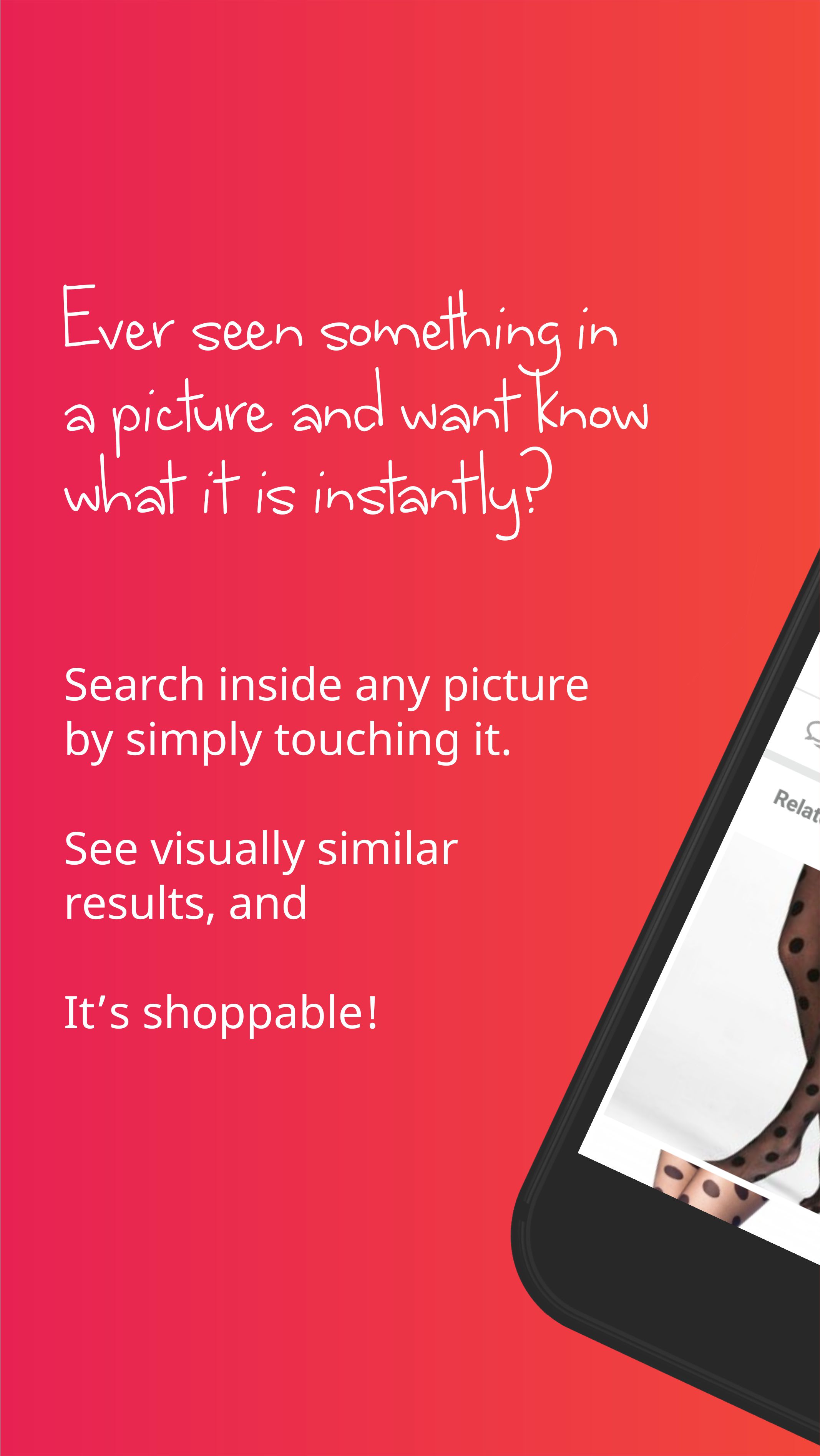 Everything pictures with your fingertip. Touchabl Pictures is a new way of interacting with pictures. By using your fingertip and touching stuffs inside a picture, you instantly know "what's up" in there. Touchabl makes you smarter, your photos will automatically come alive. Say bye to second-guessing, instantly search for anything in a picture by touching it. With your fingertip, you can find out more about your interest and share them (if you like). POWER TO YOUR FINGER TIP Ordinarily, you cannot "google" something when you don't know the name... but you can touch them with Touchabl. GALLERY MADE TOUCHABL You don't need to waste data uploading your photos online before you can use our powerful Touchabl engine on your photos. Open photos and touch to instantly get information, like, comment and share, right from the app. STORIFIED PHOTOS Tell better stories, without the work. Automatically label stuffs inside your picture and narrate them as one interesting story (coming soon)