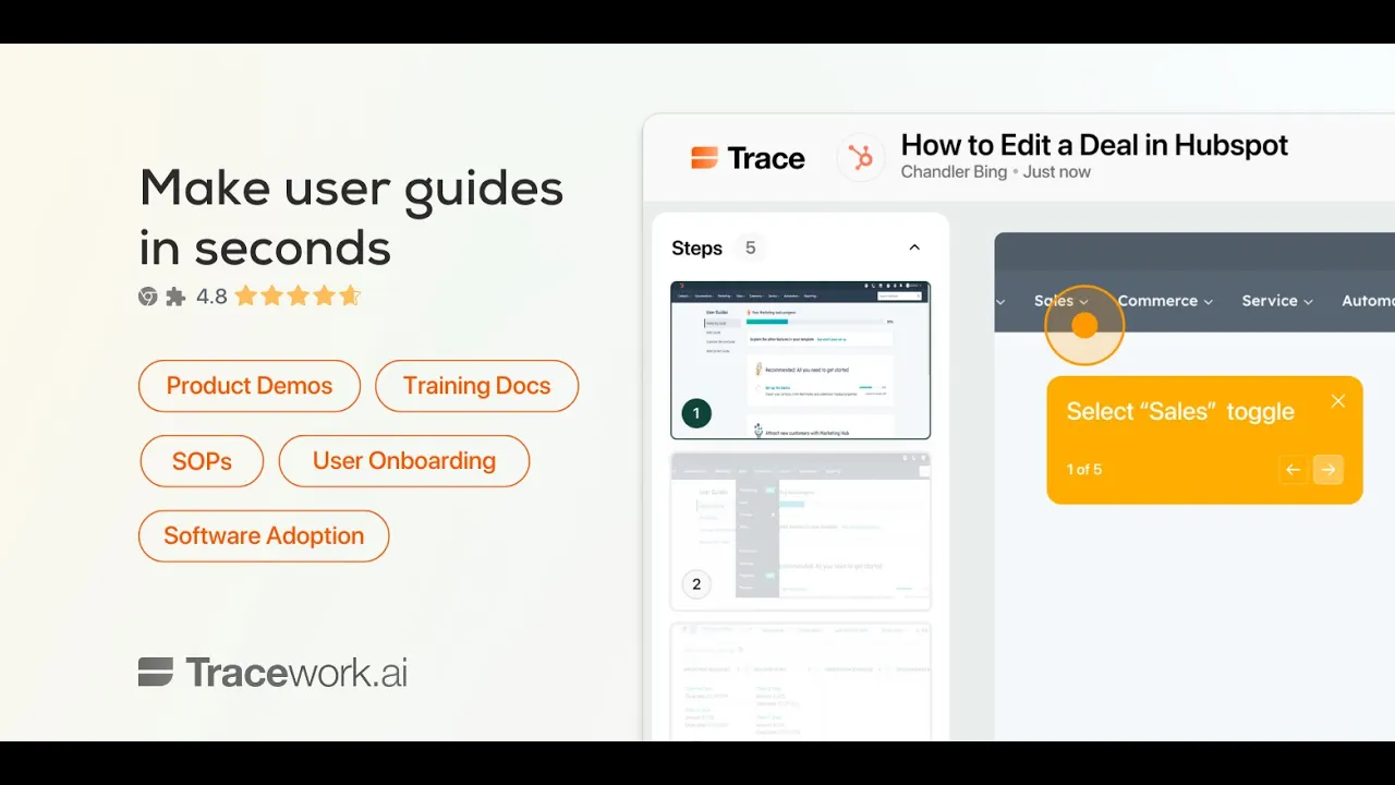 OVERVIEW Struggling to onboard new team members or hand over tasks quickly? š Trace helps you document best-practice workflows and hack-arounds in seconds; making onboarding, async demos, and knowledge sharing seamless. Documentation is now as easy as just doing the task itself. Capture and share how-to guides in seconds. Instantly create step-by-step instructions for any taskāso you can stop repeating yourself and focus on the work that matters. Trace records your process quietly in the background as you go. Just hit āStart Recording.ā It automatically turns your actions into a clear, visual guide. Share it instantly with your team. The best part? The links always reflect the latest version. Youāre great at what you doānow let others learn from you. With Trace, it only takes moments. Skip the manual documentation with guides that write themselves. Customize each guide with your own notes, images, and steps. Share knowledge effortlessly with one-click access. Cut down on repeat questions by embedding guides directly into your existing tools. Stay fast and secure with built-in redaction for sensitive content and enterprise-level security. UNIQUE FEATURES Trace has several unique selling points that set it apart from competitors in the process documentation space. While we also help users generate step-by-step guides by simply clicking through their workflows, Trace offers three key differentiators: 1. **Dynamic Steps** ā Users can insert conditional or branded steps, allowing for more personalized and flexible guides. 2. **Dual Formats** ā Each guide can be viewed as either an interactive video or a traditional document, catering to different user preferences and learning styles. 3. **Usage-Based Pricing** ā Instead of a fixed monthly fee, users can choose between a one-time lifetime deal or pay per guide createdāmaking Trace more accessible and cost-effective, especially for teams with lighter usage. THE PROBLEM WE SOLVE - š§ *Most process knowledge never gets documented* ā it stays in peopleās heads, making it hard for teams to scale or hand over work smoothly. - šļø *What does get documented often goes stale* ā like onboarding docs that no one revisits after day one. - š© *Creating guides is a hassle* ā writing steps in a doc, taking and uploading screenshots, formatting everythingā¦itās time-consuming and frustrating. - š *But with remote and async work becoming the norm*, sharing "how-to" knowledge in a clear, digital way is more crucial than ever. - š ļø *We need an easier, lighter way to document and share processes* ā one that doesnāt add to Slack pings or Zoom fatigue. Guides should be easy to make, quick to skim, and always ready when someone needs a reference. Thatās why we built Traceāto let you capture and share step-by-step workflows just by clicking through them. One click, and Trace does the rest: clean, visual, and ready to share in seconds. WHO TRACE IS FOR Trace is designed for modern, fast-moving teams who need a better way to document and share internal know-how without the overhead of traditional tools. Hereās how we serve different teams and use cases: 1. HR and Onboarding HR teams use Trace to streamline employee onboarding by turning recurring processesālike setting up payroll, accessing internal tools, or applying for leaveāinto step-by-step guides. Example guides: "How to Set Up Your Work Email and Tools on Day One" "Submitting Leave Requests and Expense Claims" 2. Sales and Marketing Sales and marketing teams use Trace to document campaign setup processes, CRM workflows, and internal SOPs, helping them onboard new team members faster and maintain consistency across campaigns. Example guides: - "Launching a LinkedIn Ad Campaign with Our Naming Conventions" - "How to Log Outreach Activities in HubSpot" 3. Customer Success Customer success teams use Trace to build internal playbooks and client-facing walkthroughs that reduce ticket volume and empower users to self-serve. Example guides: - "How to Set Up Your Account Integrations" - "Steps to Troubleshoot Login Issues Before Submitting a Ticket" 4. Agencies Agencies use Trace to standardize service delivery and reduce internal miscommunication by documenting project workflows, handover steps, and client setup processes. Example guides: - "Client Handoff Checklist for New Website Projects" - "Our Internal Process for Submitting Final Creative Assets" 5. Startups Startups use Trace to scale their internal knowledge quickly without investing in heavy tools. Founders and early team members can capture their processes as they go, so others can pick up without repeated explanations. Example guides: - "Deploying to Production with Vercel and GitHub Actions" - "Founder's Guide to Approving Weekly Ad Spend"