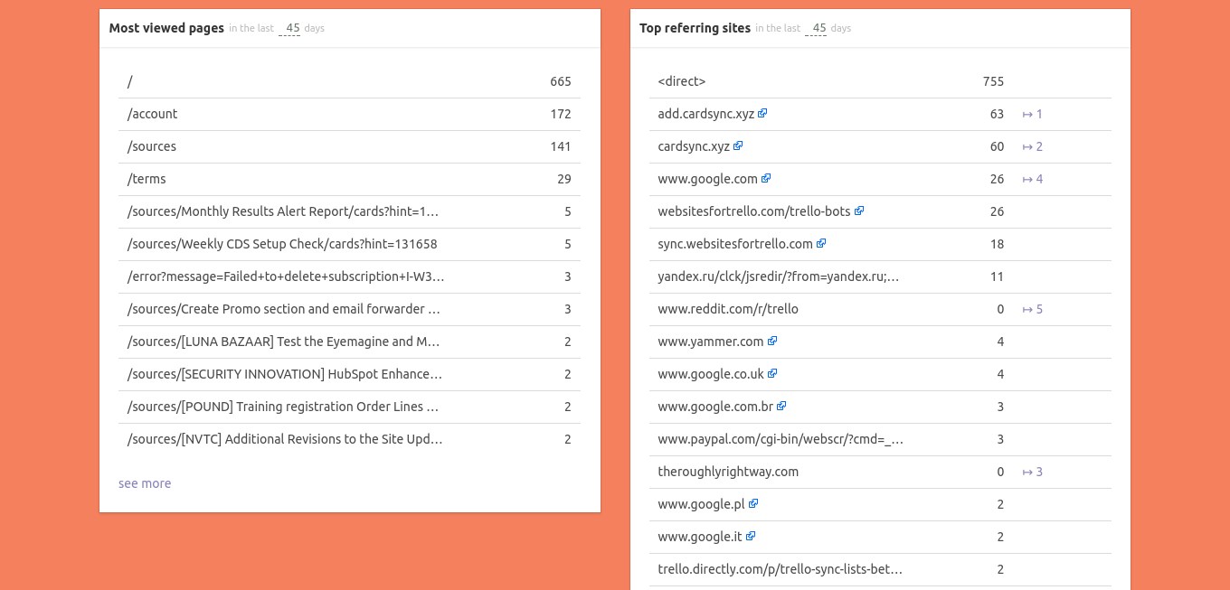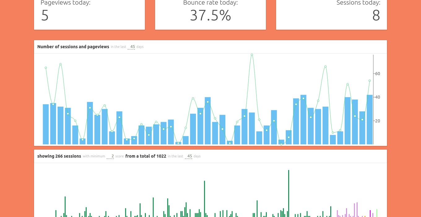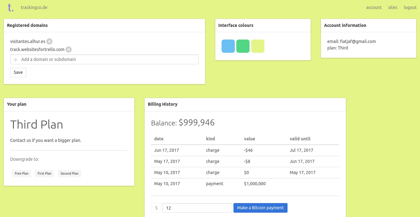 trackingco.de is web-analytics without the interface bloat, the cognitive load, the webpage slowness. If you are tired of Google Analytics and Piwik seems even worse to your humble analytics needs, trackingco.de is for you. Why is trackingco.de so good? It is a fair question to raise -- not in the way it is formulated, assuming our service is actually good, but more in the likes of why isn't any other service that provides all you do for such a small price? Well, there could be tons of web analytics as a service out there, as there are tons of services for many common tasks people of the internet face, most of them are free or have a free tier, and many of them very good. For web analytics, however, this is not so easy. Web analytics requires at least a database that takes lots of disk space. These things are not as cheap as a normal webserver with a database of only a handful items for each person using the app. trackingco.de does nothing too different here. It only stores the d