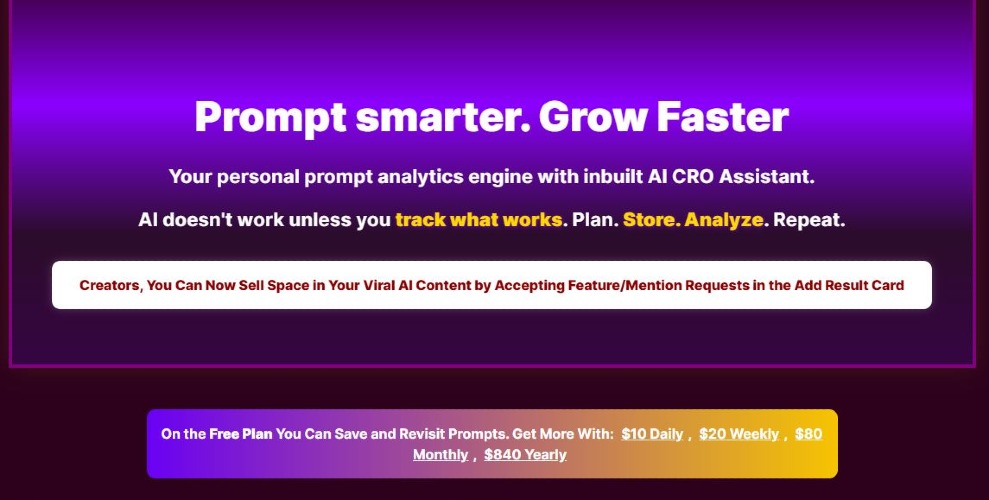 TrackMyPrompts.com is an end-to-end AI prompt planning, tracking, and monetization platform built for modern marketers, entrepreneurs, and content creators who depend on tools like ChatGPT, Gemini, or Midjourney to fuel their campaigns. Instead of letting your best prompts vanish into forgotten Google Docs, Slack threads, or screenshots, TrackMyPrompts gives you a dedicated, centralized prompt library. You can easily save, categorize, and tag your favorite prompts, building a living swipe file that grows more powerful over time. The platform’s interactive calendar view lets you schedule prompts for specific days and channels—whether you’re running a week-long Twitter hook test, planning LinkedIn thought leadership posts, or managing an entire blog series. Each prompt becomes part of a structured content plan, eliminating the chaos of scattered notes or ad hoc campaigns. Once your content is live, TrackMyPrompts does what spreadsheets and scattered analytics tools can’t: it automatically tracks performance metrics tied to each prompt. You’ll see likes, shares, clicks, responses, and even lead conversions, organized into a clean visual dashboard. This lets you spot which types of prompts, topics, or wording consistently drive engagement and revenue—so you can double down on what actually works. A standout feature is the monetization toggle for creators. If you’re an influencer or content marketer with consistently viral posts, you can activate “Accepting Features & Mentions” directly inside TrackMyPrompts. This allows brands or partners to approach you for paid placements in your high-performing content—turning your proven prompt-driven posts into valuable ad real estate without ever leaving the platform. TrackMyPrompts is built for flexibility and growth. Solo creators can start as guests and track personal campaigns, while teams can sign in via Firebase authentication to collaborate, share prompt libraries, and monitor collective campaign results. The stack is robust, with a scalable backend that ensures your data—your intellectual property—is secure and accessible. At its core, TrackMyPrompts.com is about bringing discipline, data, and revenue opportunities to the AI content boom. It’s your organized prompt vault, campaign calendar, performance tracker, and marketplace all rolled into one. Whether you’re a startup founder testing SaaS landing page angles, a consultant refining cold email hooks, or a creator monetizing your social posts, this platform ensures your prompts aren’t just clever—they’re profitable. Plan smarter. Track deeper. Earn more. That’s the promise of TrackMyPrompts.com.