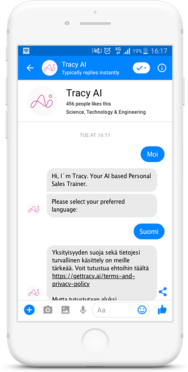 Tracy AI helps salespeople to improve their sales results. Tracy AI works as your sales coaching partner after each workday by engaging you into bite-sized sales coaching sessions. It’s an easy and fun way to stay on the path of constant learning and improvement. It is based on ‘on-the-job’ self-reflection that is proven to be one of the highest impact learning methods. The solution also has a reporting part that helps sales directors to get an overview on their individual team members sales skill assessment and feedback.