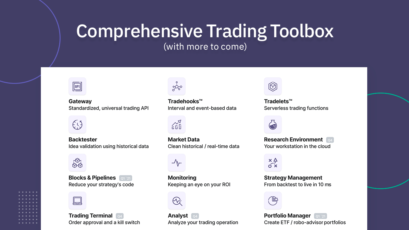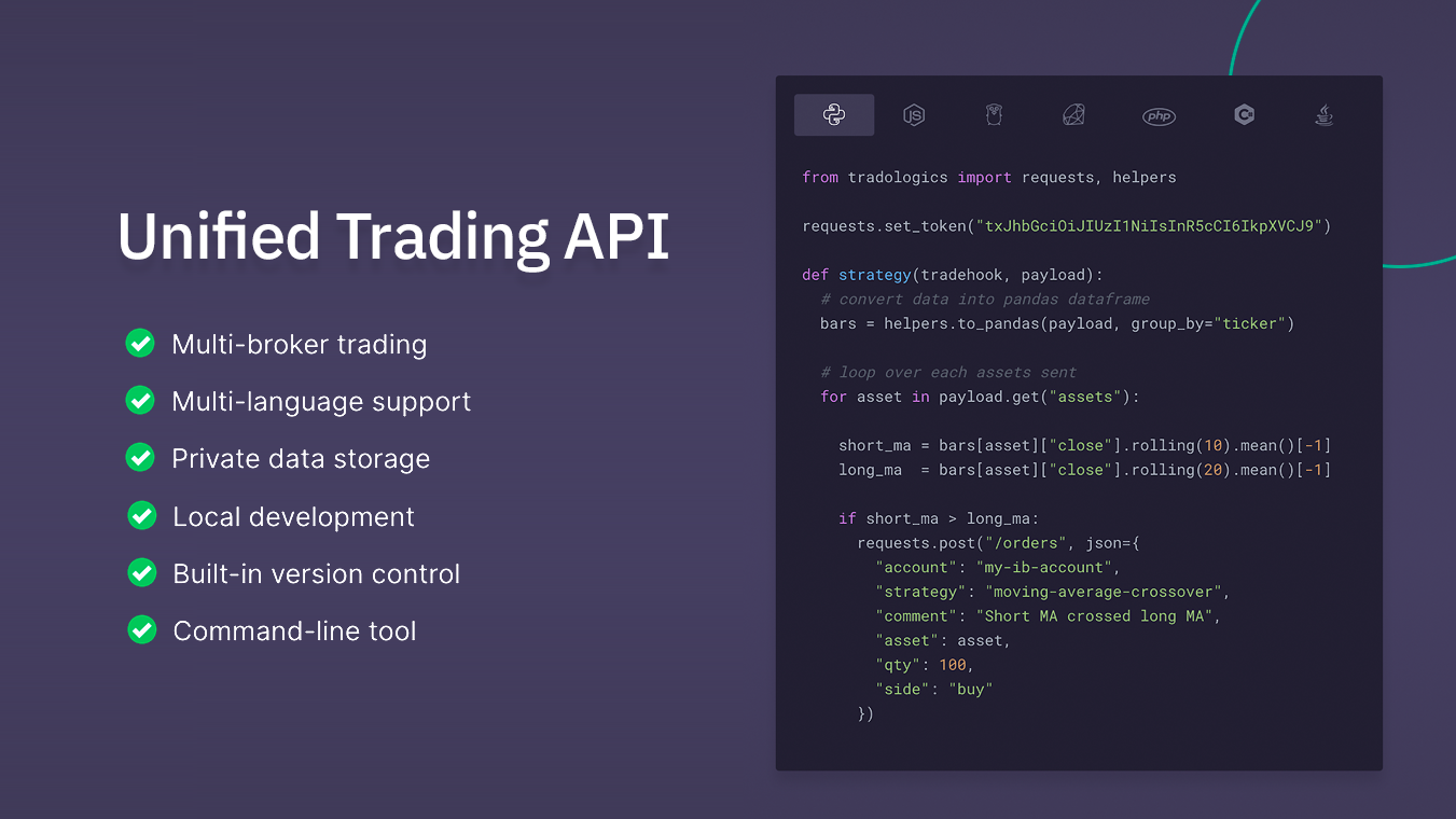 Tradologics is the fastest way to go from idea to trading stocks, ETFs, Futures, FX, and Crypto – without infrastructure headaches. It is a huge time and money saver to experienced traders and an enabler to new ones.