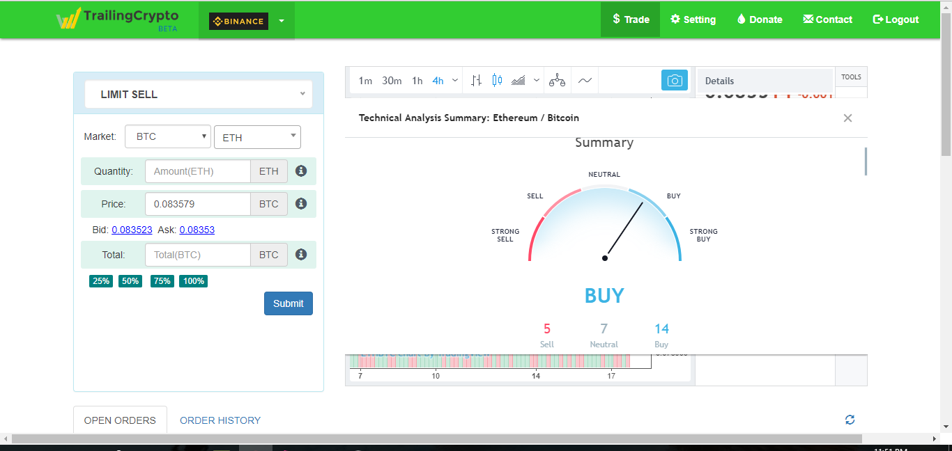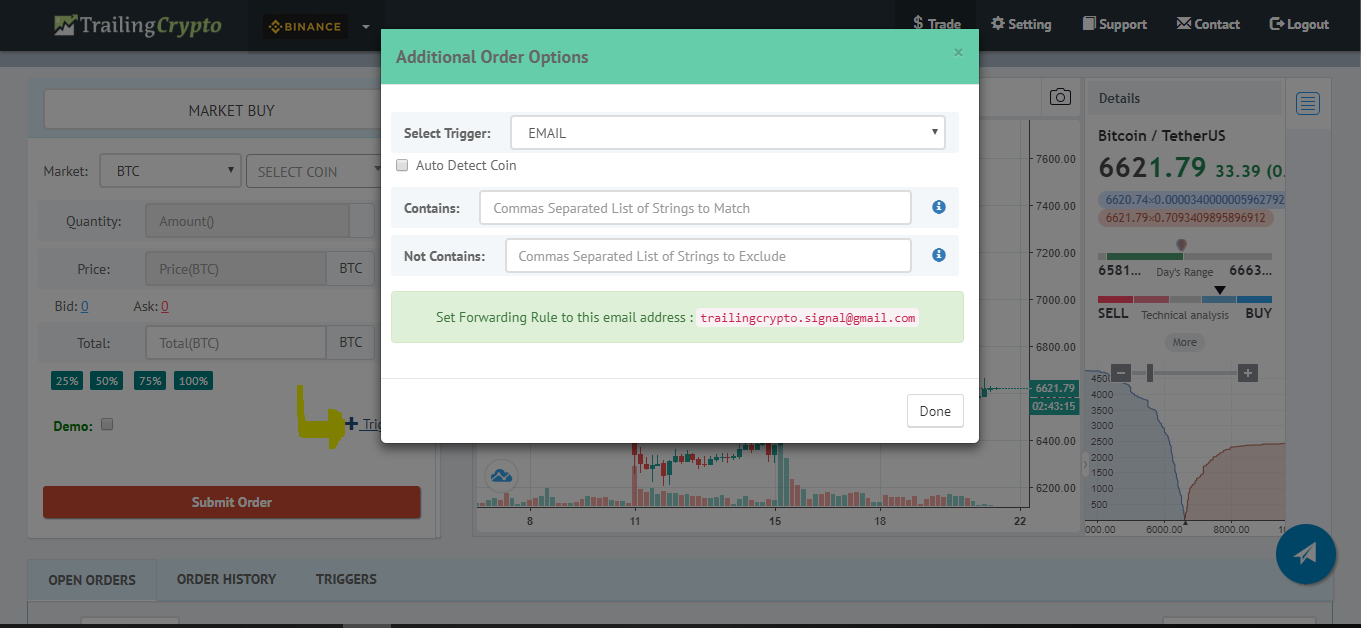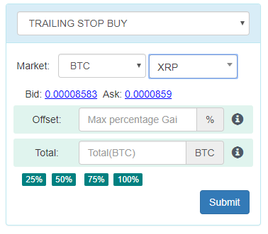 TrailingCrypto provide a free unified cryptocurrency trading platform, so that investors can place advance order types on various exchanges from single place and can grow thier profits & limit losses along with portfolios managment. Supported Exchanges: Bittrex, Binance, Kucoin, Cryptopia, CEX,IO, Cryptopia, HuobiPro, Okex, Hitbtc OrderTypes on all exchanges even if the exchange doesn't support it: 1) Simple: Market and Limit orders 2) Advance: Trailing Stop, Take Profit, Stop Loss and Instant Sell/Buy orders 3) Conditional: OSO and OCO Telegram Signals, Email Notification based Trigger orders and much more...