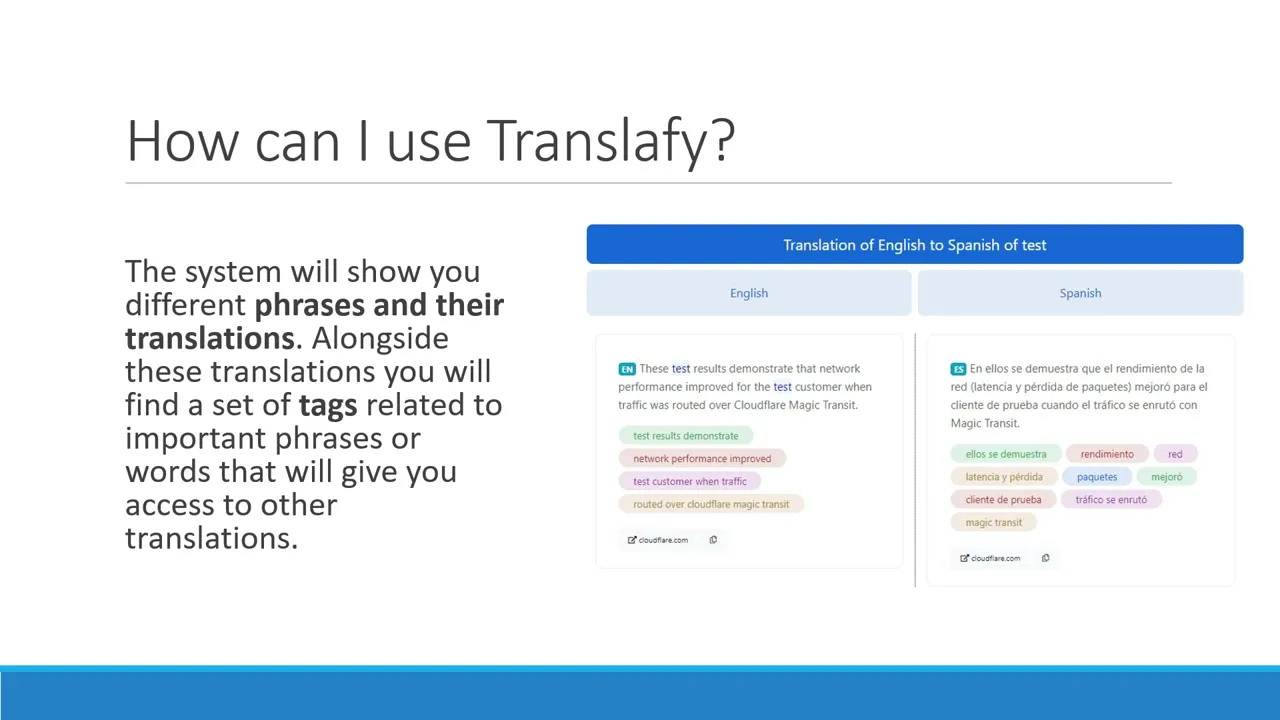Translafy is an internet translation search engine that allows translators and users to find real translations for any search. We help translators to make more accurate translations, as well as users to be able to communicate with other people in different languages