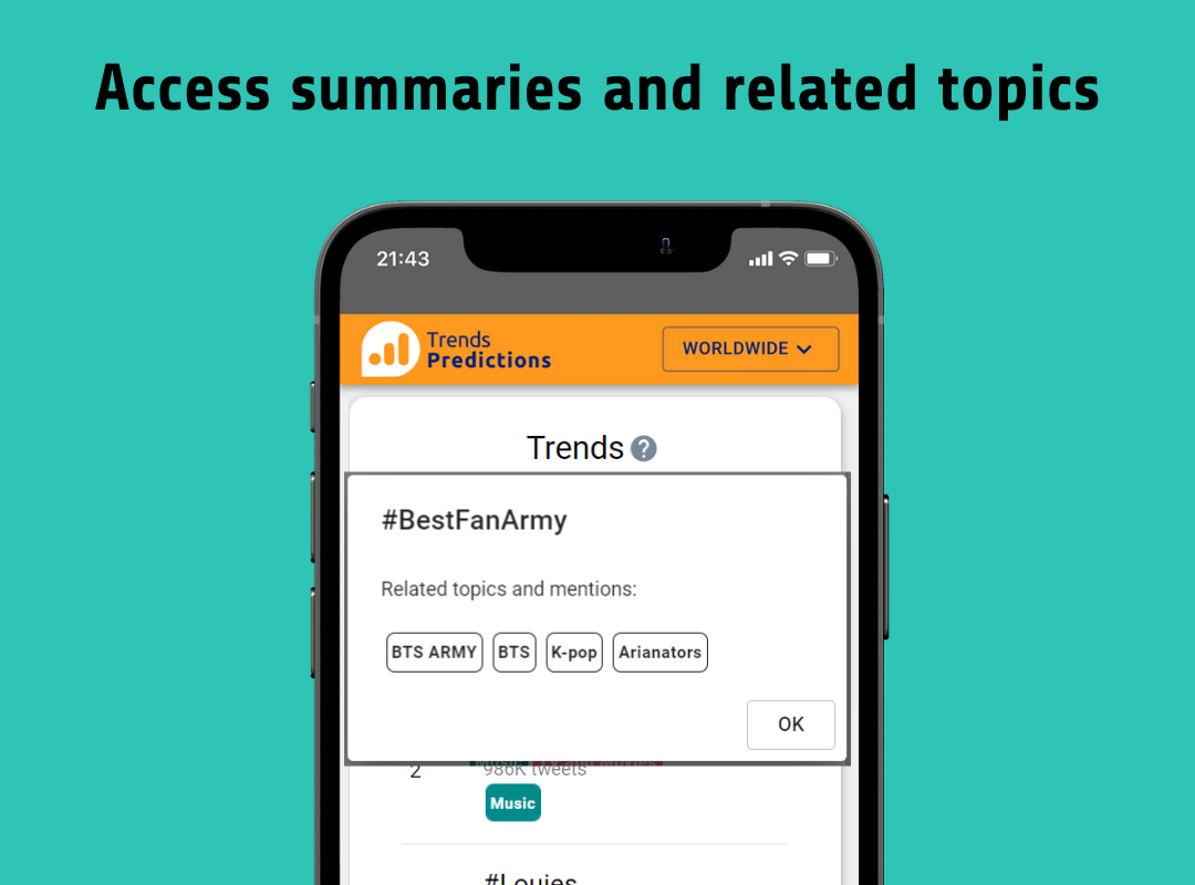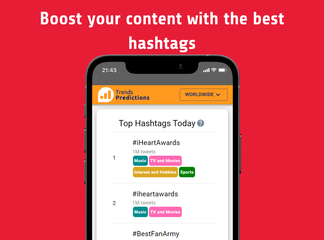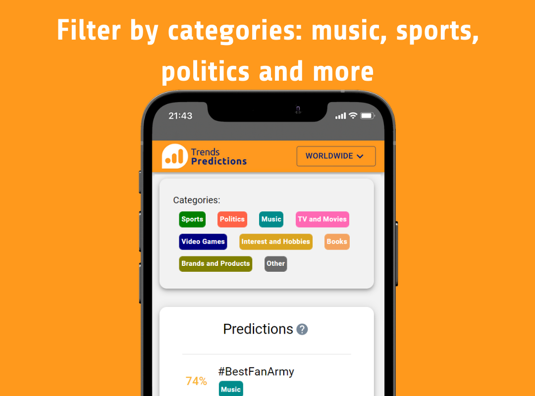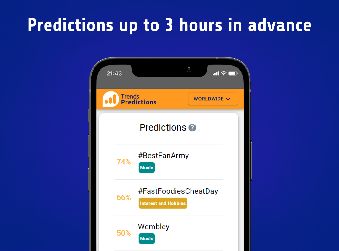 Trends Predictions uses artificial intelligence to predict trending topics and help marketers, journalists and content creators keep track of the best trends and find new content ideas. Use these predictions to discover new trending topics and find what people are talking about in more than 400 places around the world.