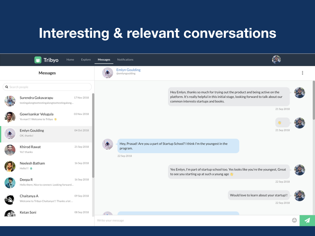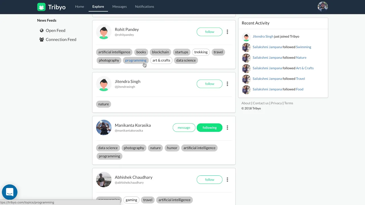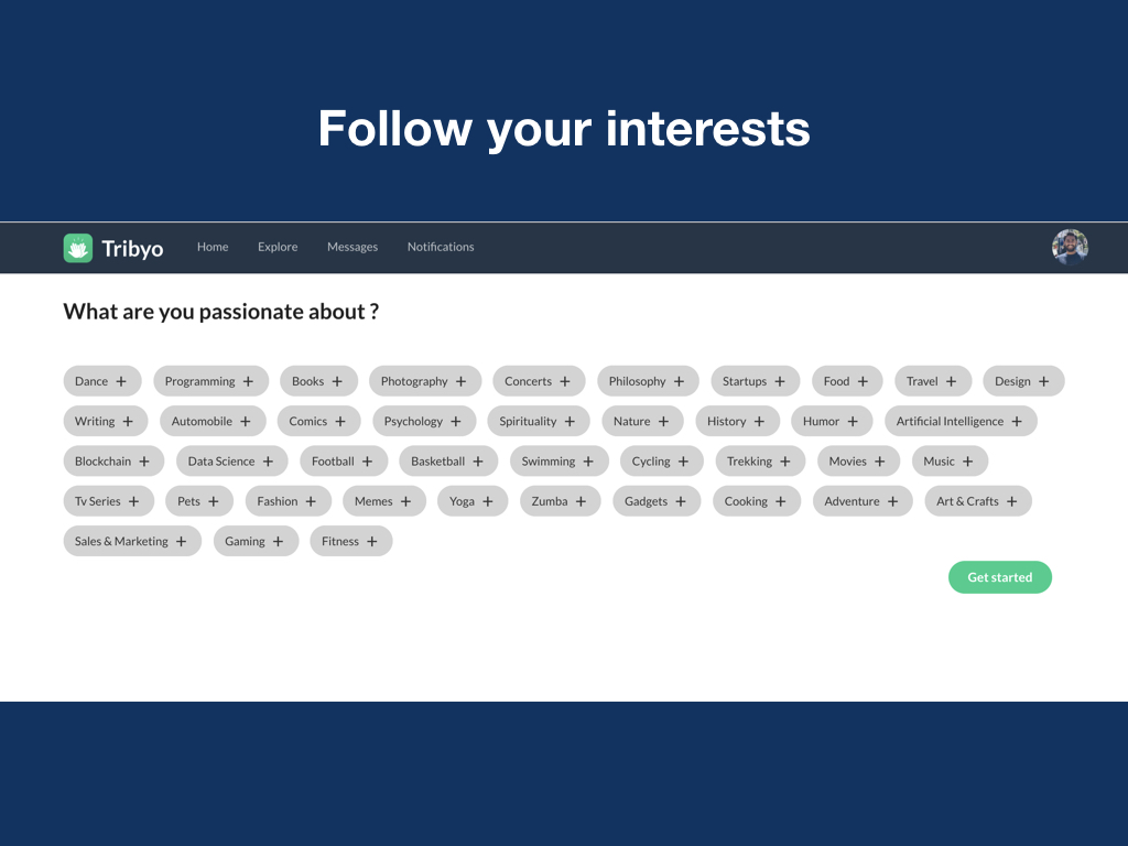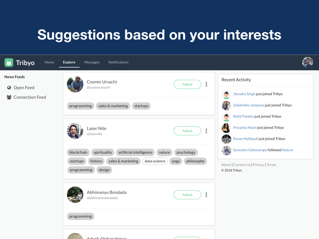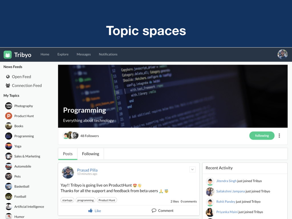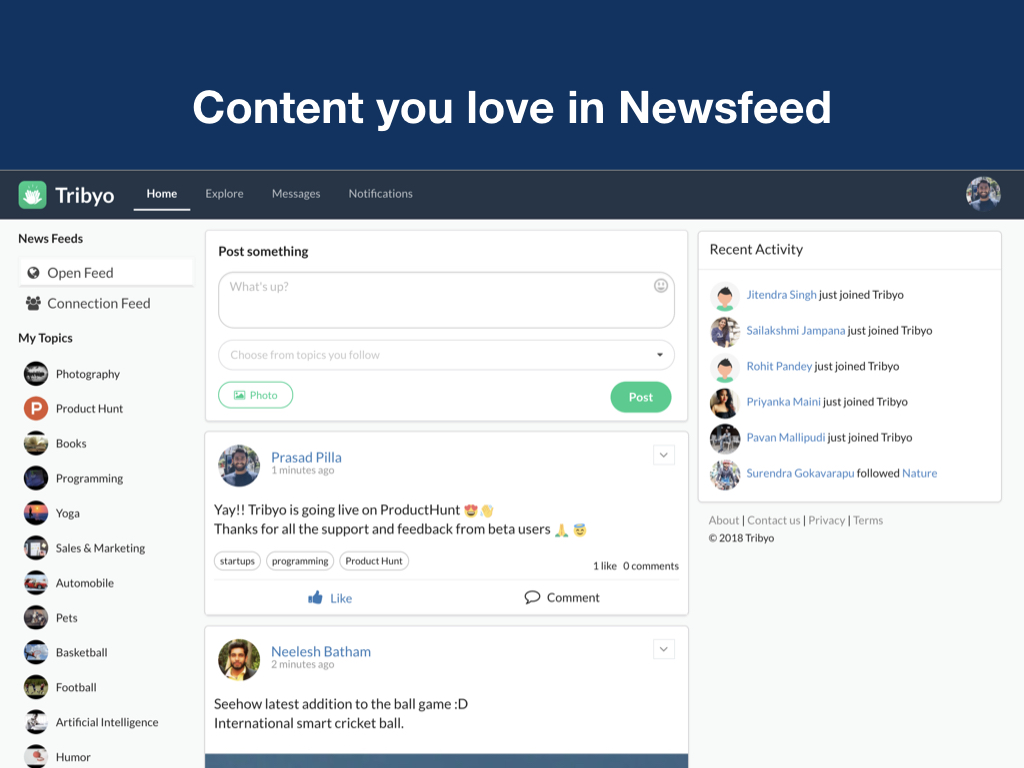 Hey there, I’m Prasad, founder of Tribyo. It's an interest based social network. Tribyo helps you form your own tribes, you can discover, connect and interact with people with similar interests. Highlights: * It's your own space, you have your own tribes to talk about things you're interested in. * Content and interactions only about topics you follow. You won't see a post unless it's about a topic you follow, even though you follow the person who posted it. * Open platform, explore endless possibilities I worked very hard to get Tribyo to life, would love to get your feedback. I’m always here to answer any questions.